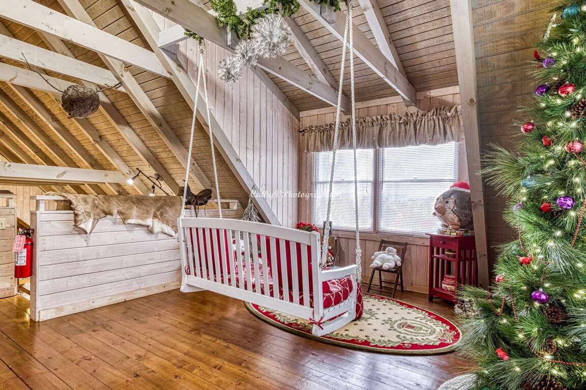 Hanky Panky Cabin is a unique cabin featuring a year-round Christmas Loft. Follow the lighted handrail staircase to the loft and flip the "Santa's light switch" and all of the Christmas lighting comes alive! Swing away all year long in the Christmas Loft while enjoying the great views. 60 in one game table to enjoy on those rainy days and nights!