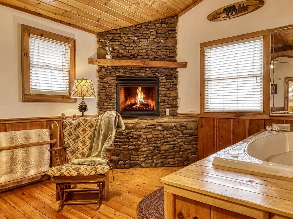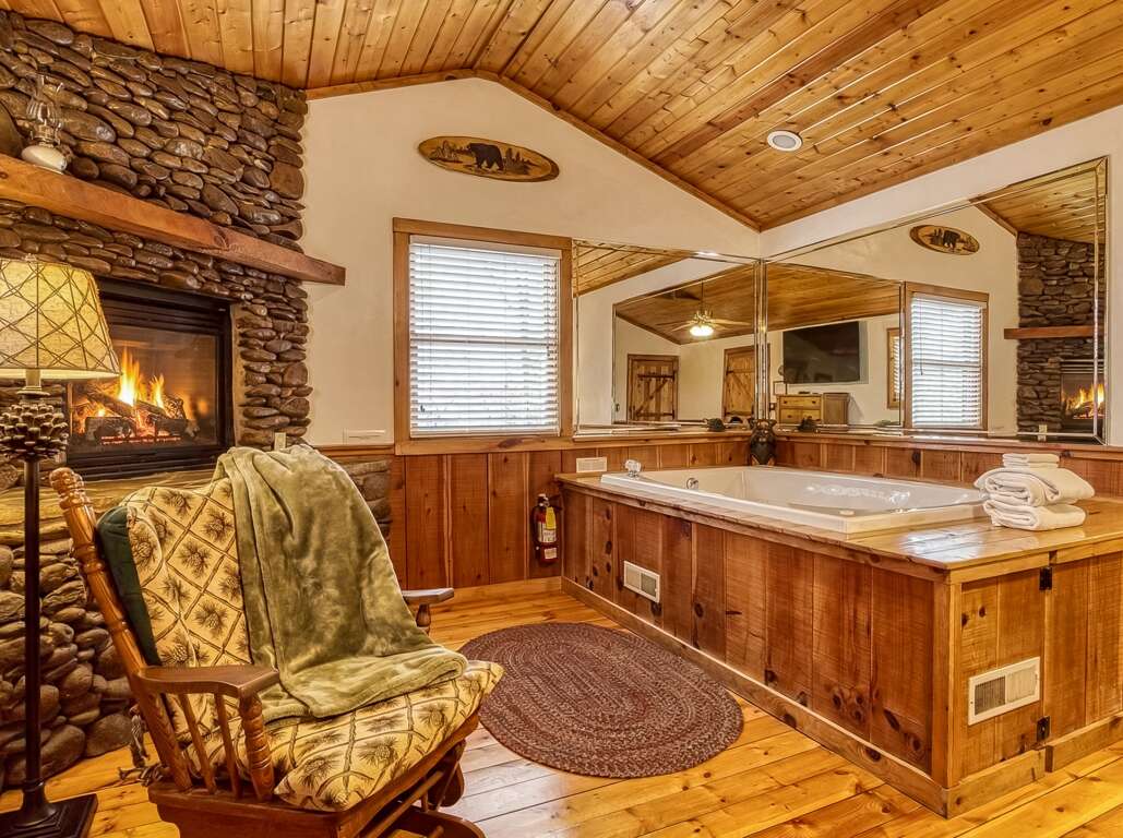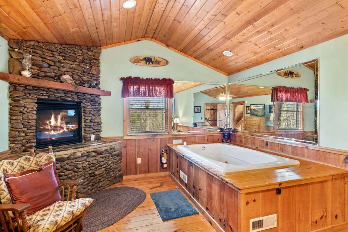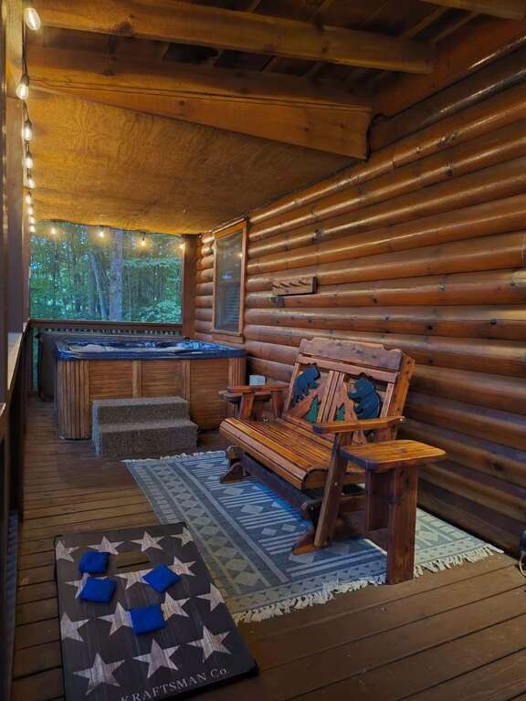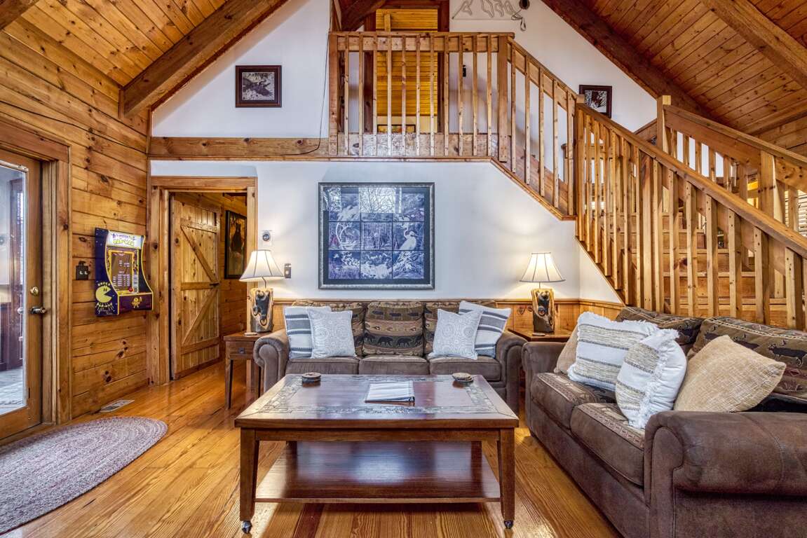 Log cabin vacation rental in Sevierville with 2 bedrooms, hot tub, vaulted living room, and easy drives to Dollywood, Gatlinburg, and the Smokies.