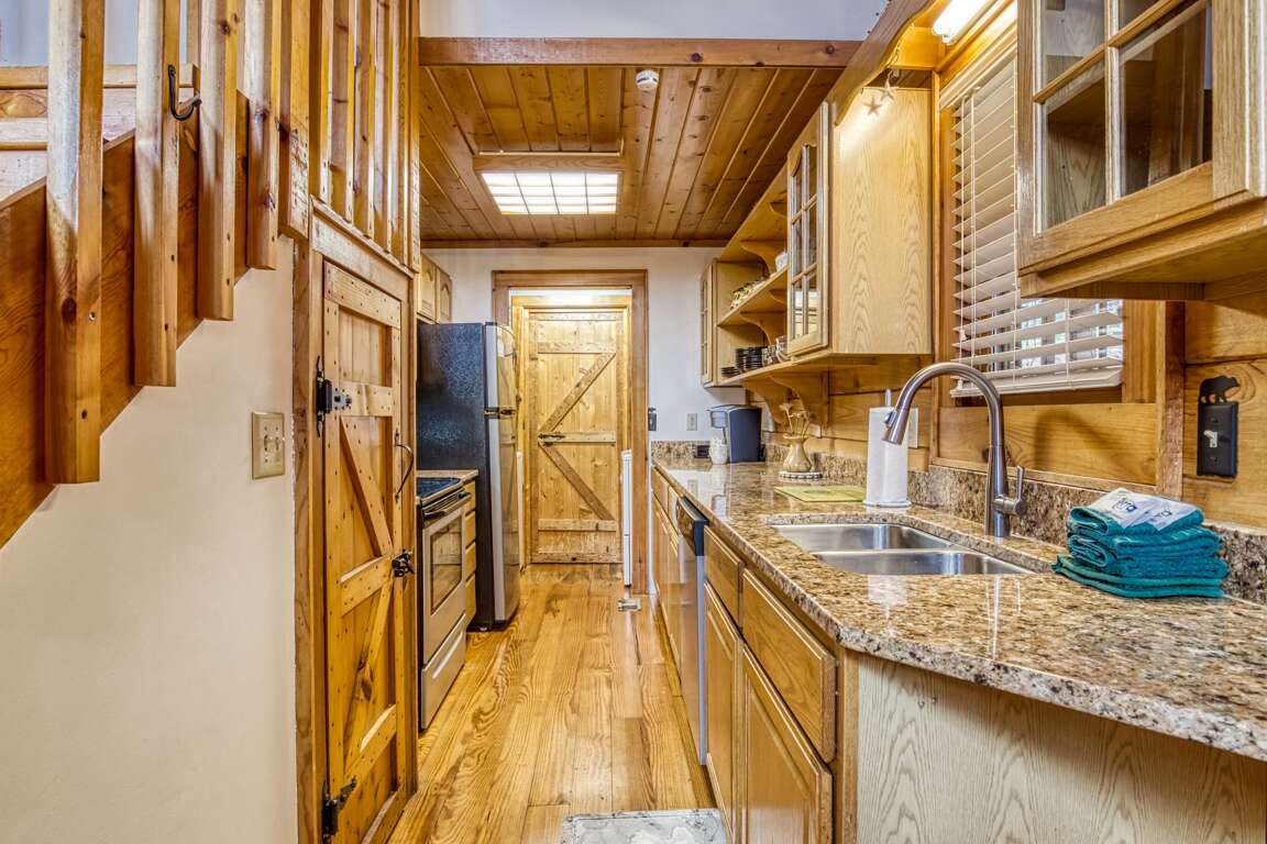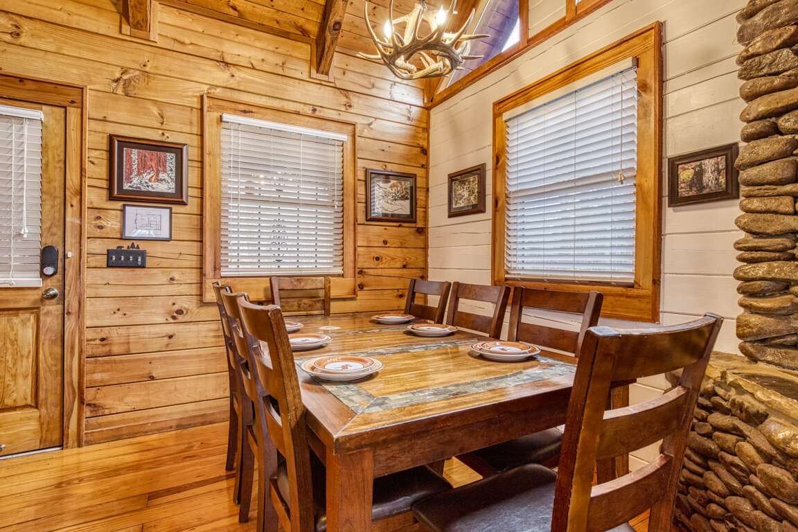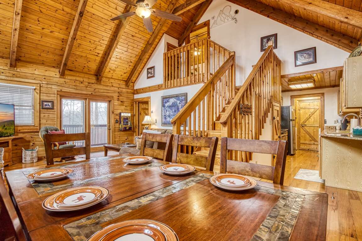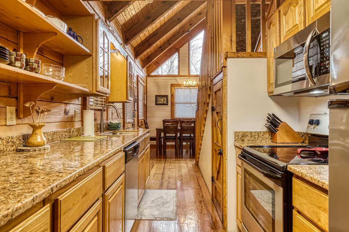 The stunning vaulted living room features a floor-to-ceiling stone gas fireplace as its centerpiece. Sink into comfortable seating after exploring Dollywood or hiking the Smokies, stream your favorite shows on the flat-screen TV, or simply soak in the mountain ambiance. High-speed WiFi and a dedicated workspace make it easy to stay connected if needed.