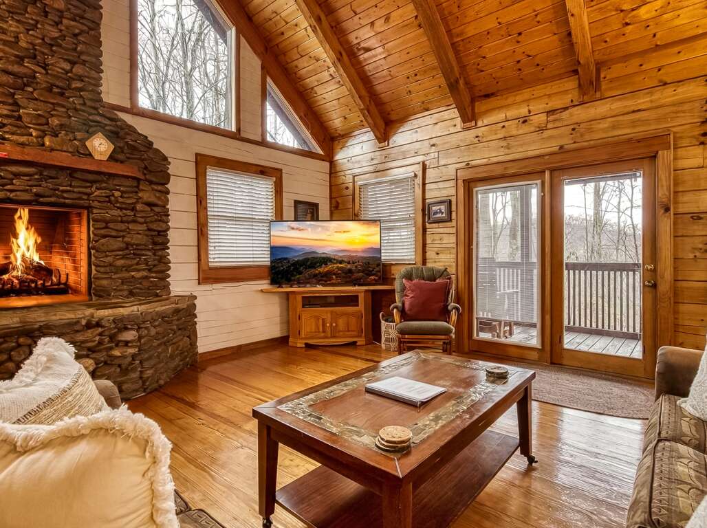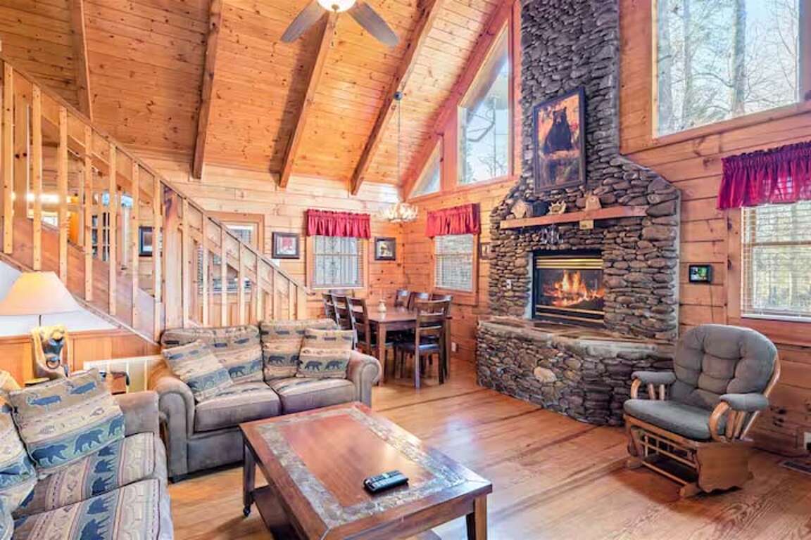 Escape to your private mountain sanctuary at Bear's Lair, a beautifully appointed 2-bedroom log cabin perfectly positioned between Gatlinburg and Pigeon Forge. With soaring vaulted ceilings, a dramatic stone fireplace, and a private hot tub overlooking peaceful forest views, this charming retreat offers the ideal blend of rustic elegance and modern luxury.