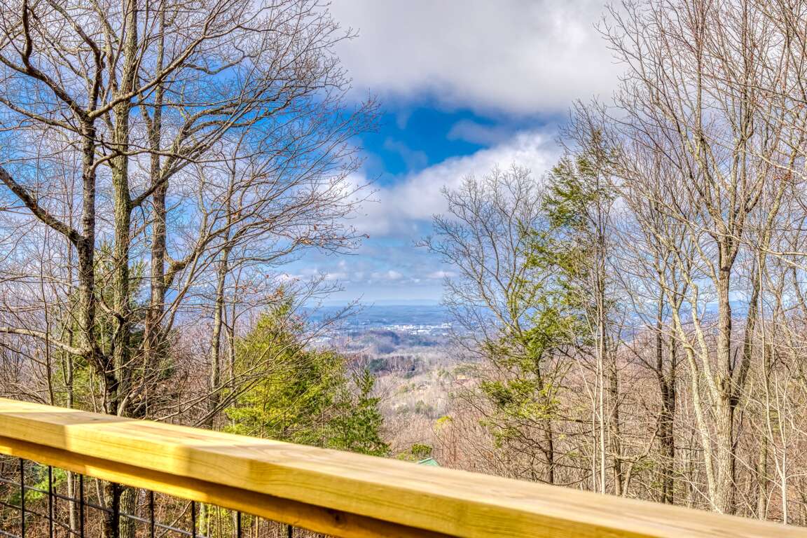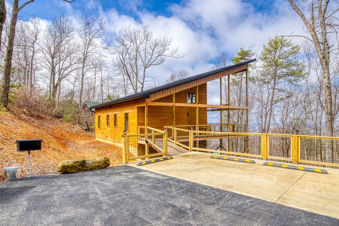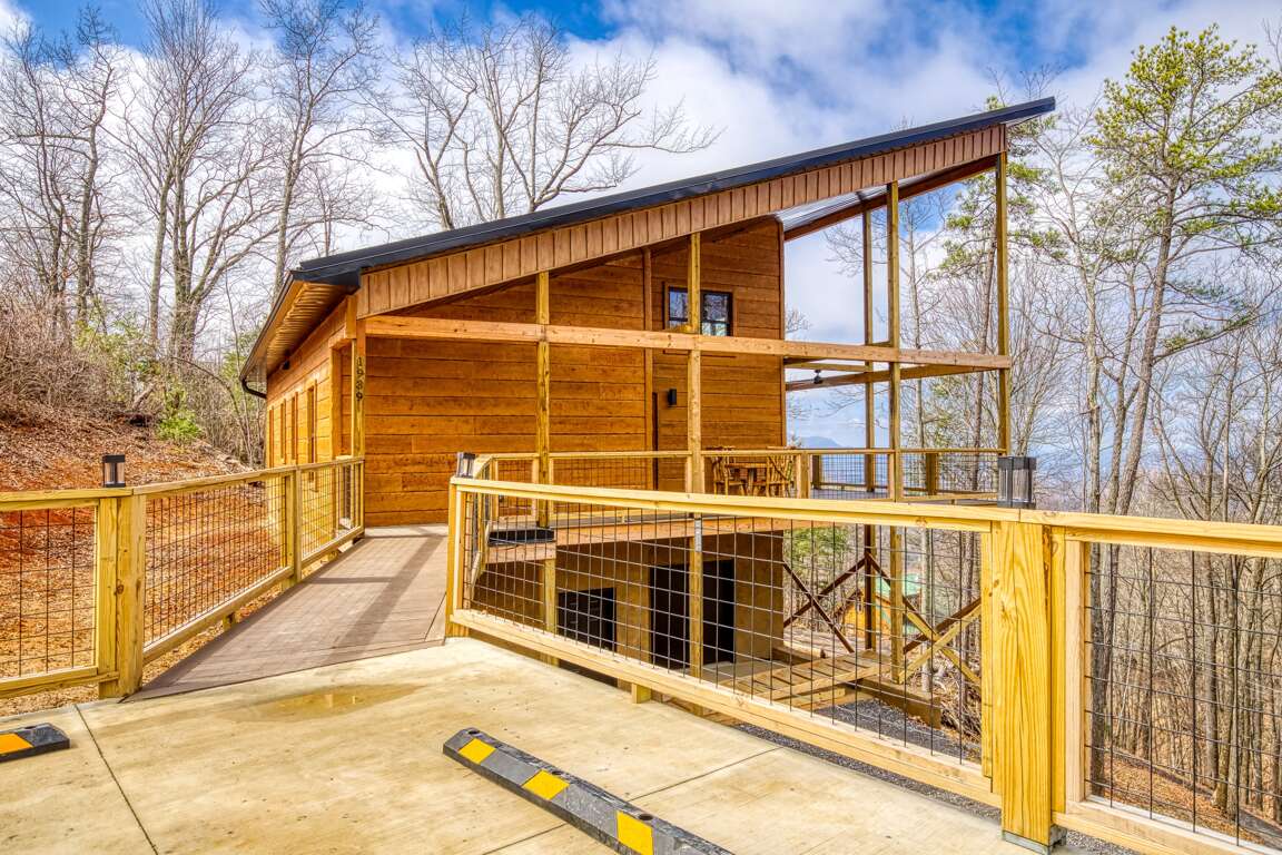Modern cabin vacation rental in Sevierville with two king suites, ADA accessibility with no stairs, mountain views, and a large deck near Gatlinburg.