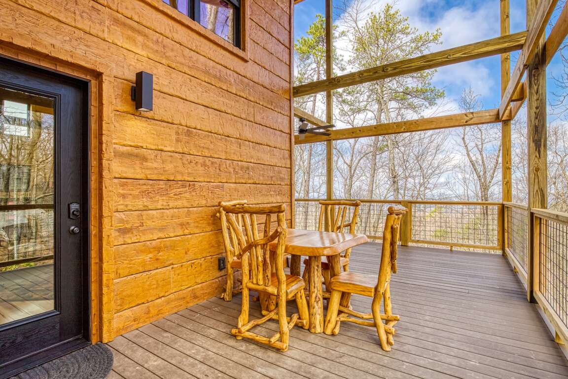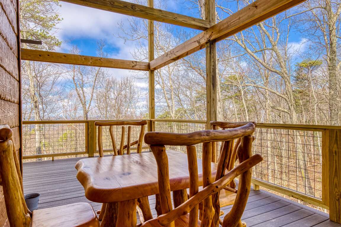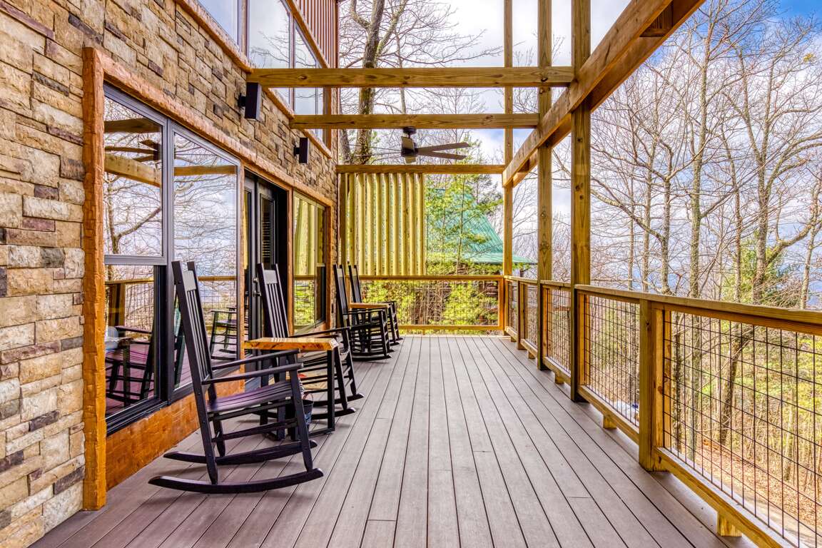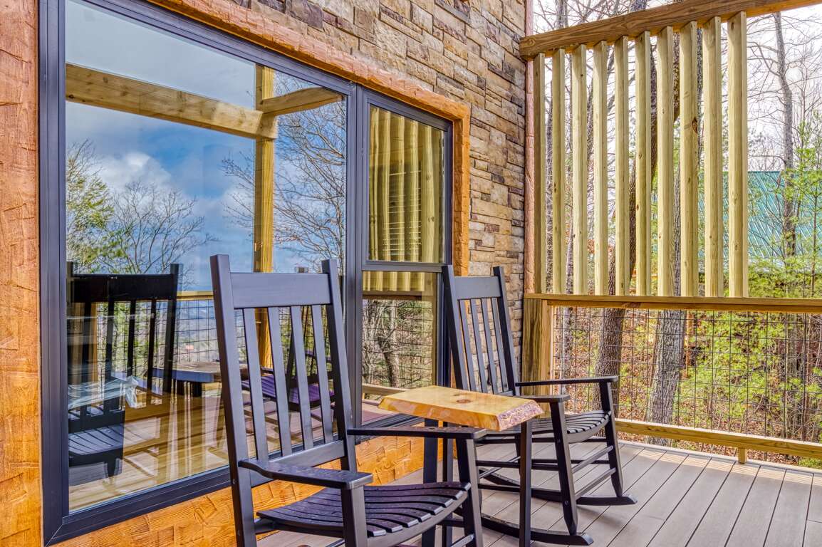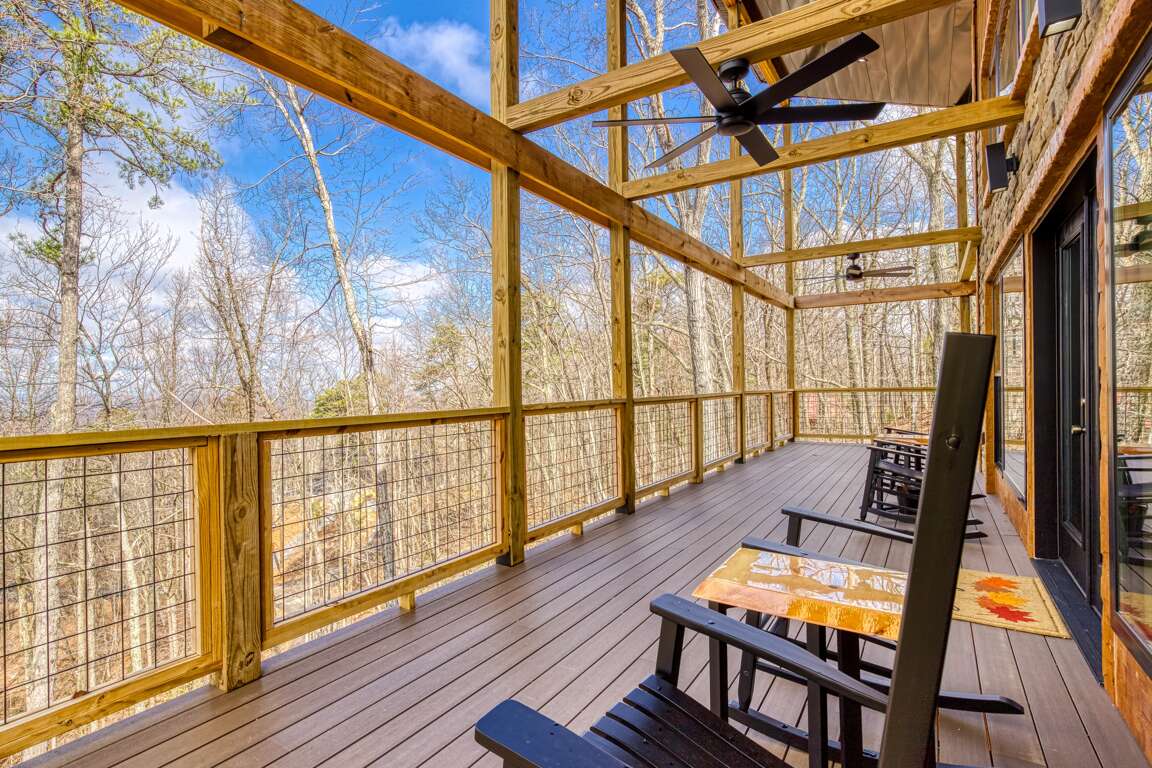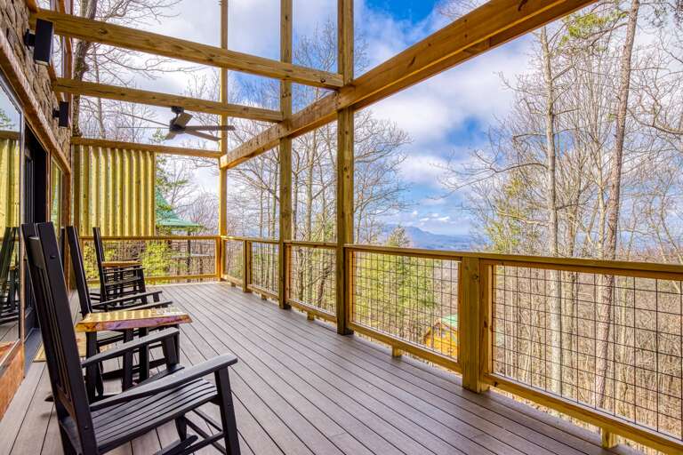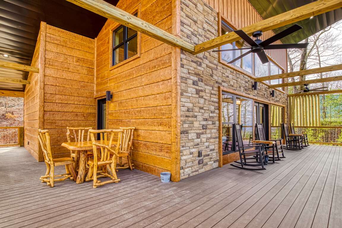 And then there’s the best part…the large L-shaped deck!!! There’s a rustic table and chairs that will make a perfect place for lunch, rocking chairs, and a big fan to carry those cool mountain breezes while you sit and listen to the leaves rustle in the trees. It’s the kind of place you can close your eyes, let your worries drift off, and fall in love with the peace of the mountains. Truth be told, it’s the part you’ll find yourself missing long after you head back home.
