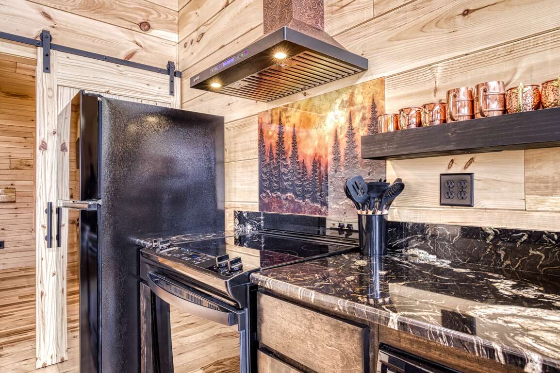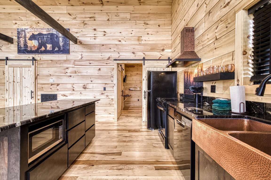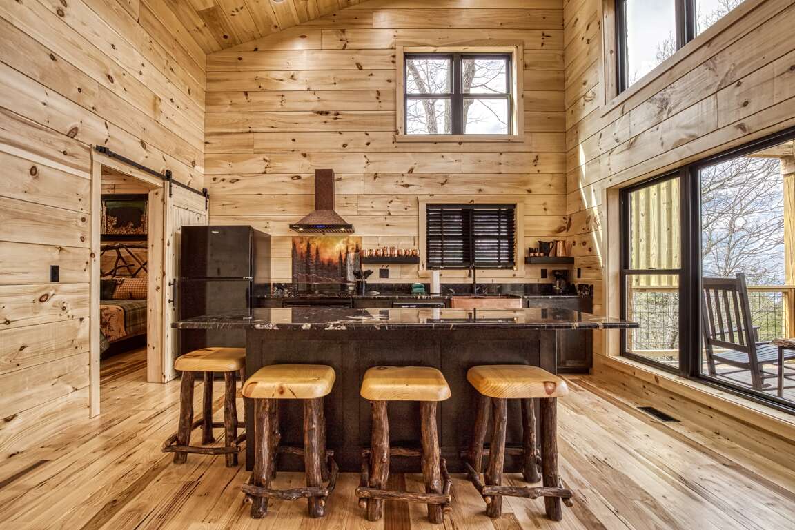 Tucked up in the breathtaking mountains, this sleek, modern cabin is the kind of place that lets you breathe again. It offers two spacious King suites and two bathrooms, with wide-open mountain views from the open-plan living area and a big, beautiful deck that is made for slowing down and soaking it all in. The clean, simple design keeps things light and peaceful; every detail exudes serenity—from the marble countertops to the airy layout. Everything feels just right. And the entire cabin is completely ADA accessible, so you can move easily and comfortably—no stairs anywhere.