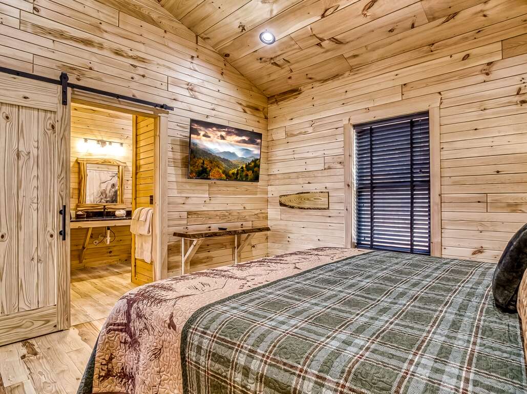 Through the last set of barn doors, you will find the second King suite just as comfy and inviting. This bedroom also features a large, comfy King bed, a flat-screen TV, and a large, roomy closet. This room has its own private bathroom with a large walk-in shower, oversized counter space with lower shelves and knee space underneath it as well.