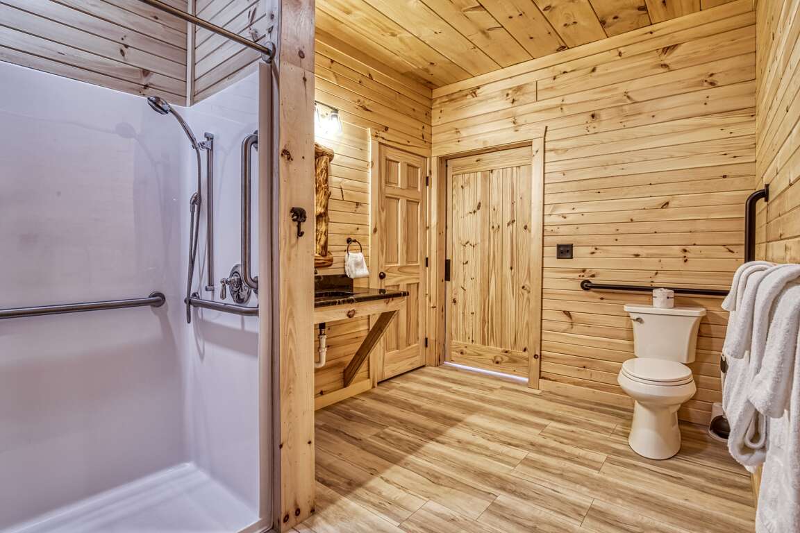 Slide open the first set of large barn doors, and you will find the first King suite—large, comfy King bed, flat-screen TV, and roomy closet with lower shelving and hanging bars for your clothes. This suite has access to the fully accessible bathroom too! Complete with a walk-in shower with grab bars, a shower chair, and a removable shower head, and a sink with lower shelves and knee space underneath for comfort and ease.