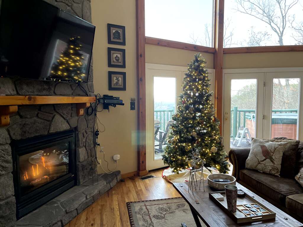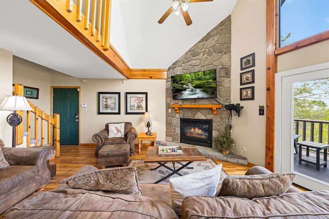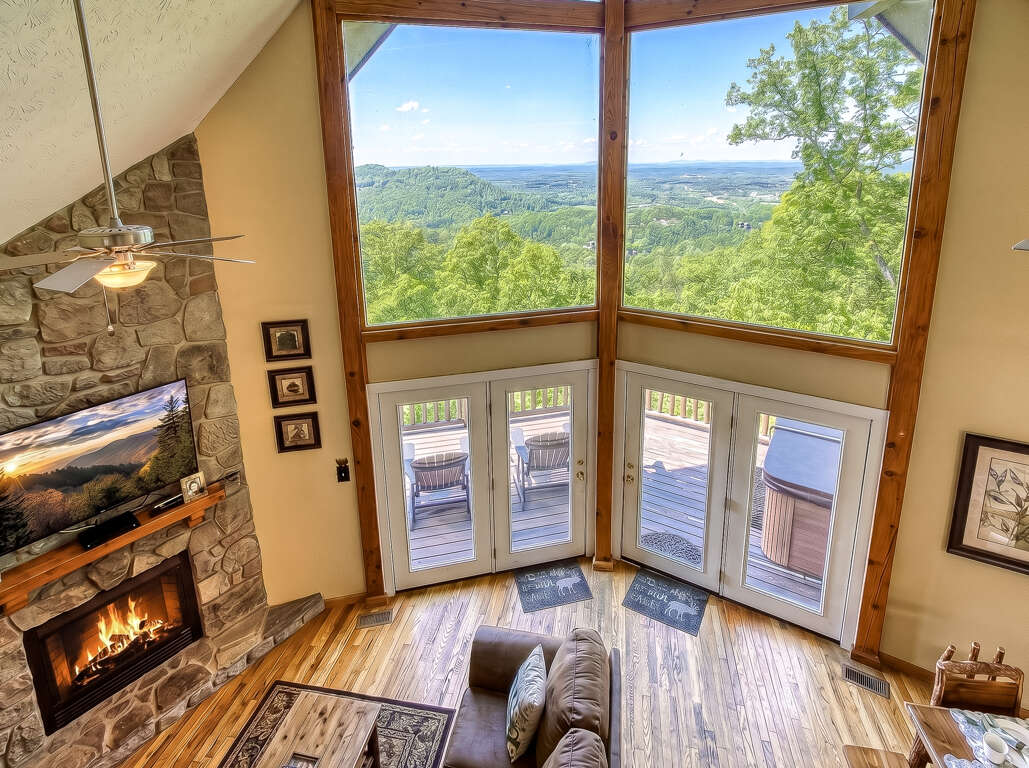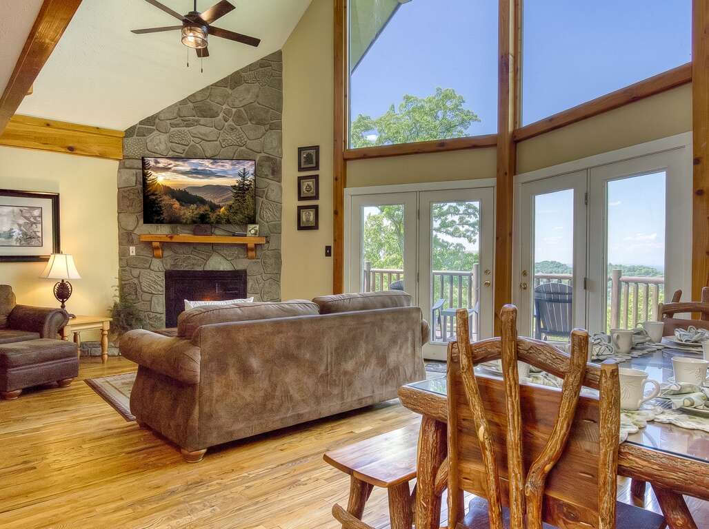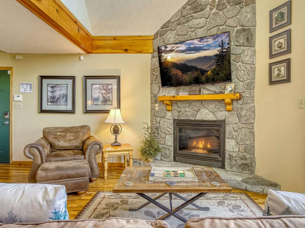 Here, you can watch your favorite programs on the large flat-screen TV, curl up in front of the crackling fireplace or simply enjoy the views from the floor-to-ceiling windows that frame the Smoky Mountains.