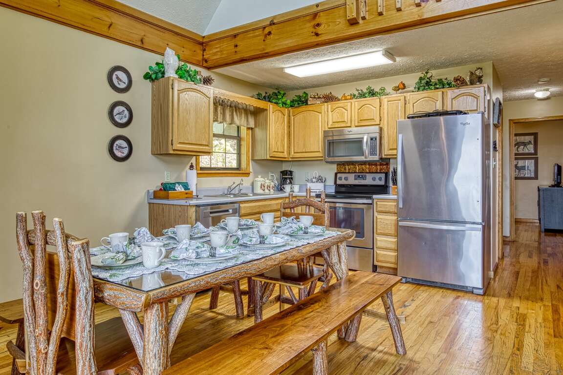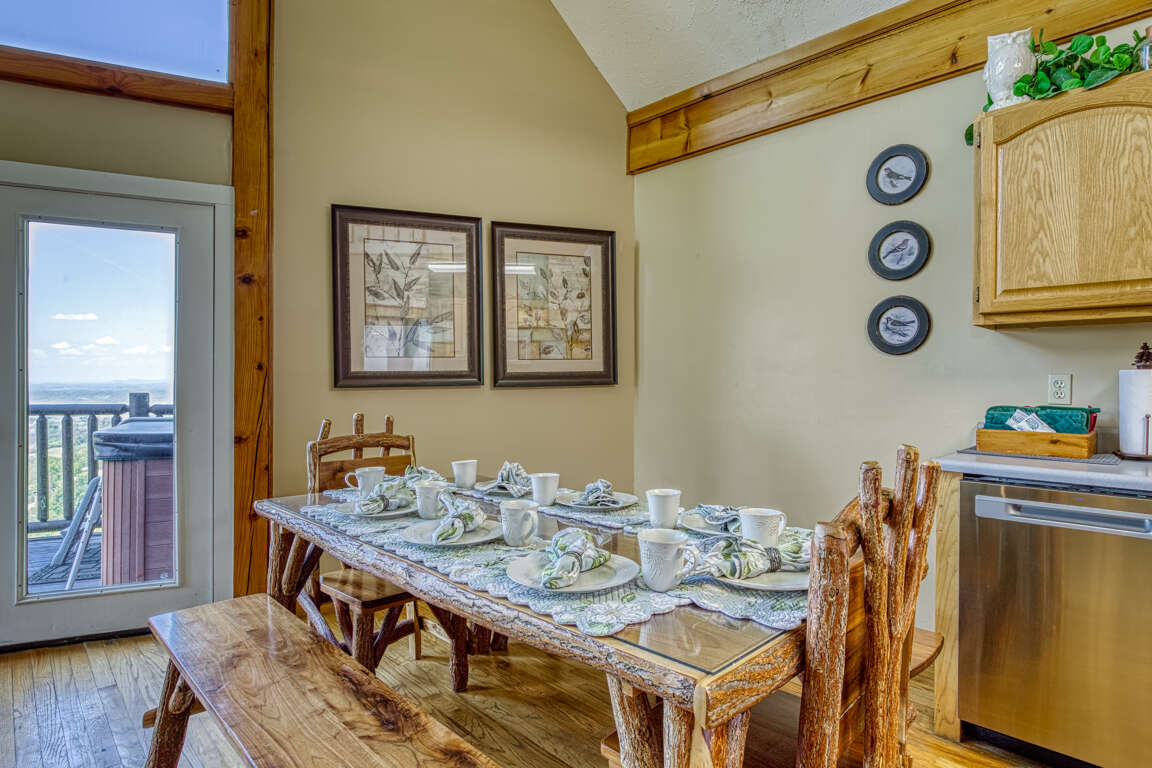 Nearby is a beautiful, handcrafted, custom log table that seats up to eight. What a great family space—either for dining or just for chatting! Bring some board games and have a family game night!