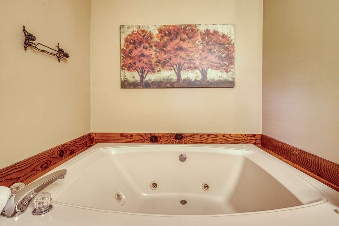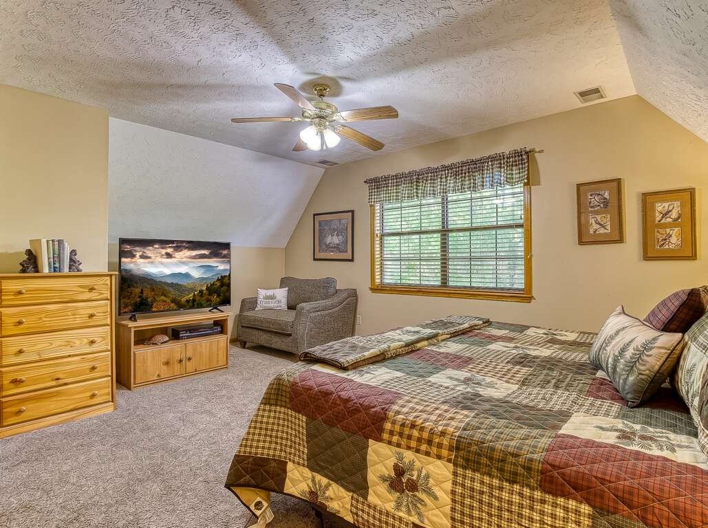 What a lovely upstairs space! The sitting room loft overlooks the Smoky Mountains and into downtown. Just off of this space is a spa-inspired full bath with an oversized jetted tub and an additional spacious king suite.