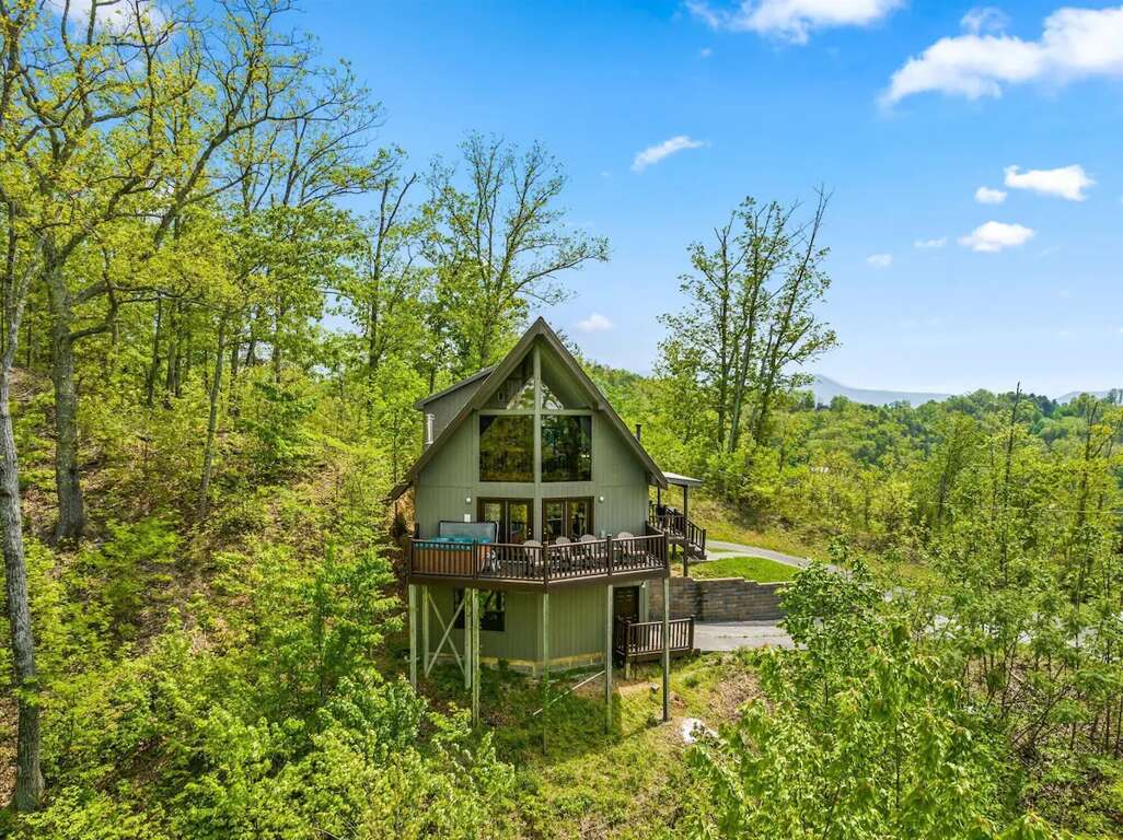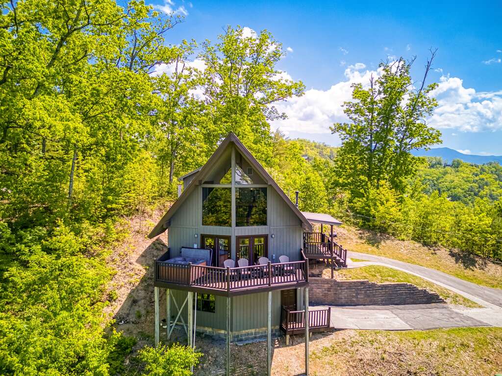 Mountain-view cabin vacation rental in Pigeon Forge with 3 bedrooms, hot tub, pool table, fireplace, and a full kitchen for group trips.