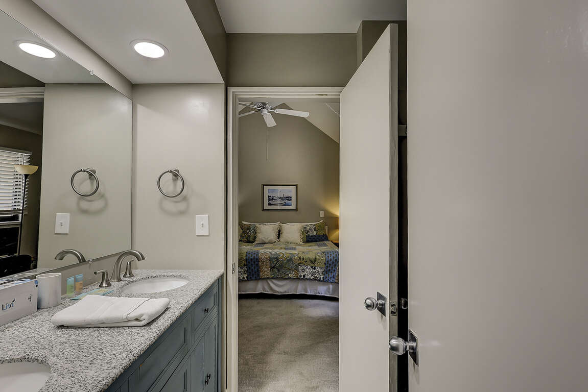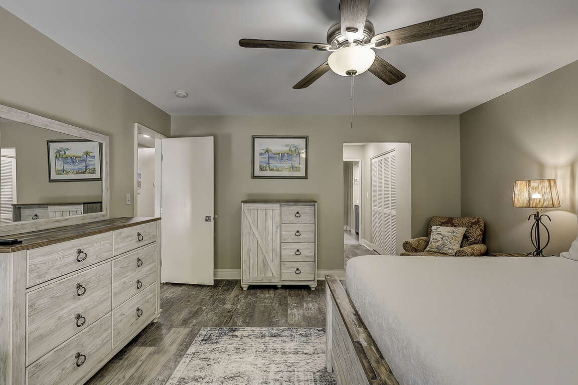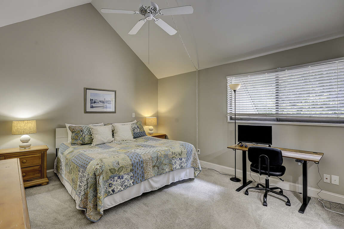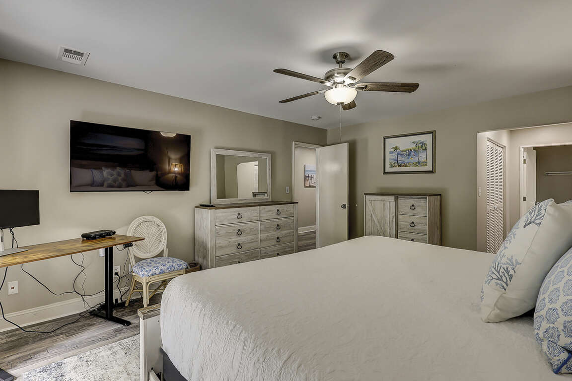 Guest Bedroom 1 (Upstairs): King bed, shared bath, desk, monitor, ceiling fan