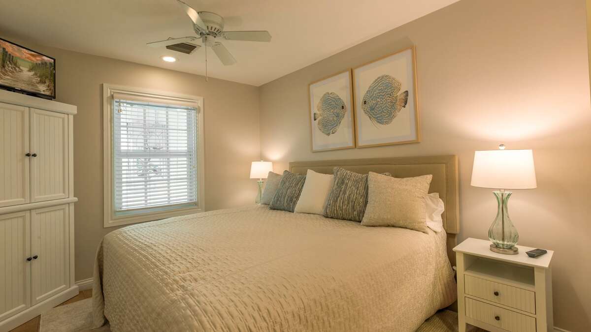 A social area offers a couch with decorative pillows, a ratan chair, and a round coffee table. On the opposite wall hangs a flat screen positioned for easy viewing from the couch. It’s the perfect place for discussing the day’s plans or playing a round of Key West Monopoly. Maybe drink your coffee or cocktails here but out by the pool or on the front porch is also ideal. Of course, there’s cable and wireless high-speed internet. If you find you need an extra bed, the couch is also a full sleep sofa.