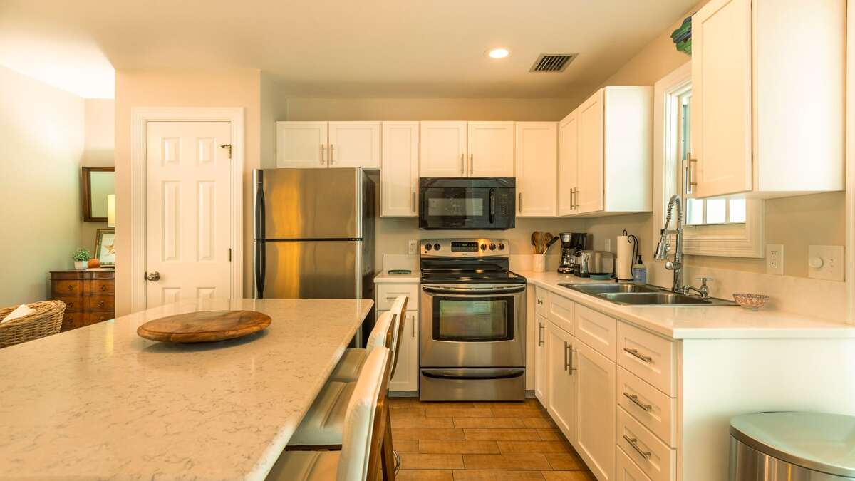 The kitchen is well equipped with everything you need to make a meal or warm up leftovers from dinner out the night before. And plenty of cabinet space above and below creates space to store stuff. There’s a coffee machine, toaster, dishes, glassware, silverware, a stove with a glass cooktop for easy cleanup, and a double sink. A back door just off the kitchen leads to a small patio and a washer/dryer for laundry. Parking, should you need it, is on street.
