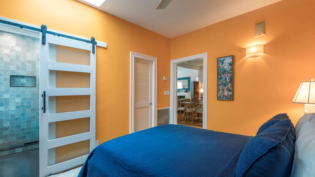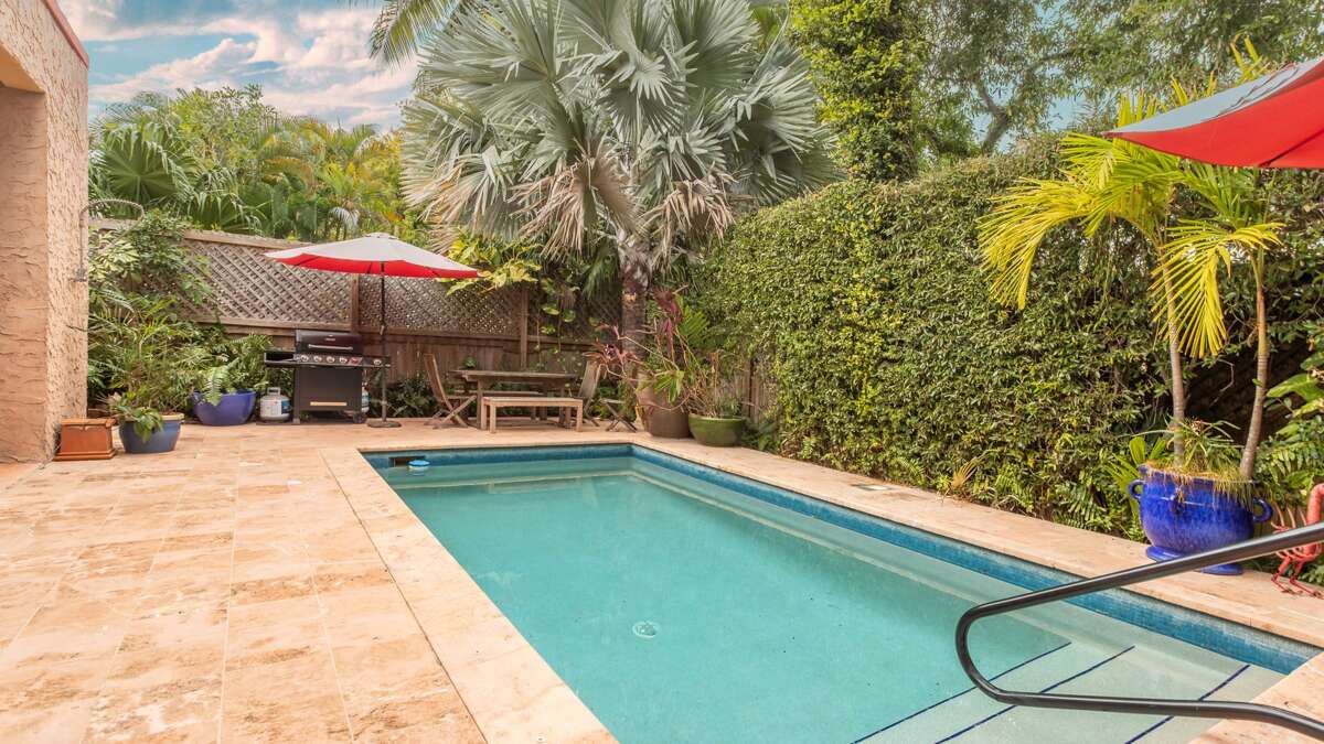 The back French doors to the outside oasis open from the kitchen which is convenient for moving food from the inside to the outside. The back area is ringed in landscaping creating privacy. The spacious rectangular pool and separate in-ground spa complete the sense of a backyard paradise you won’t soon forget. Grill some local fish or steaks on the outside BBQ then eat your meal alfresco at the nearby table under a red market umbrella. Take a swim in the heated pool or dip into the spa or just relax with a book in one of the chaise loungers. Maybe shower off under the open-air shower. Laundry facilities are behind closed doors here too.