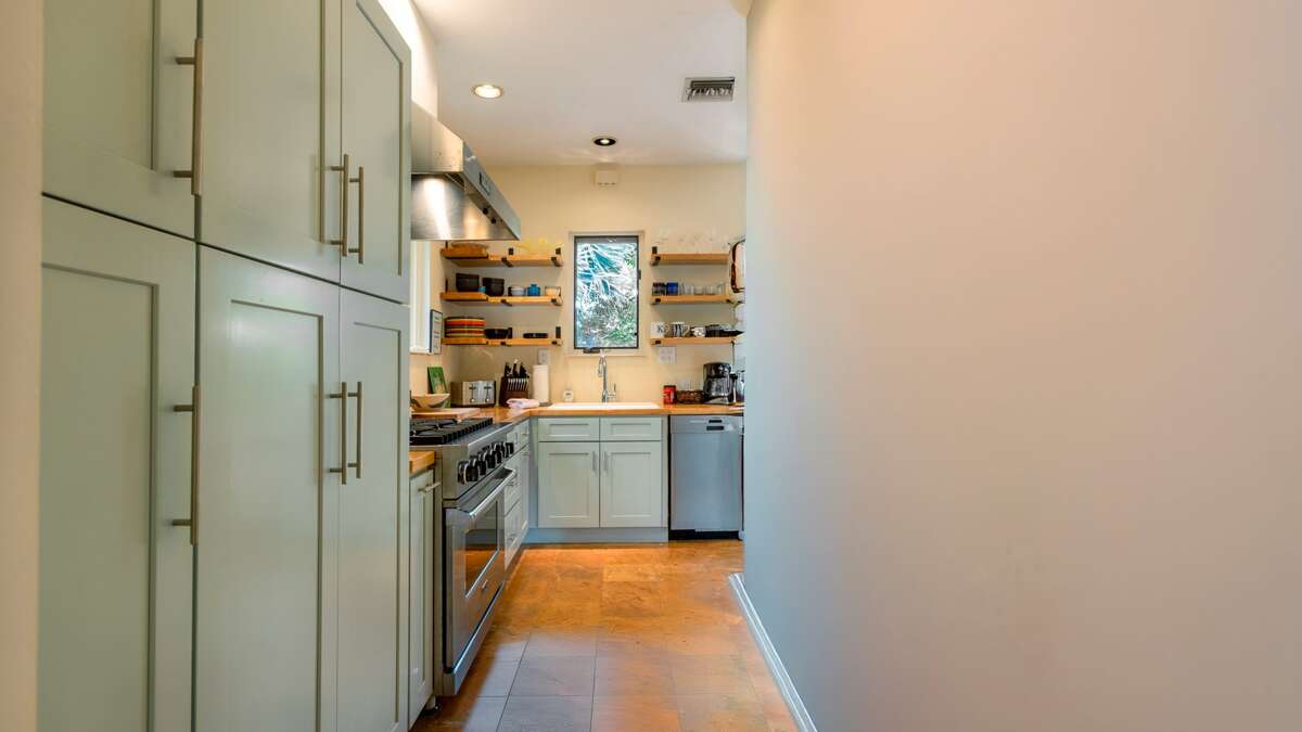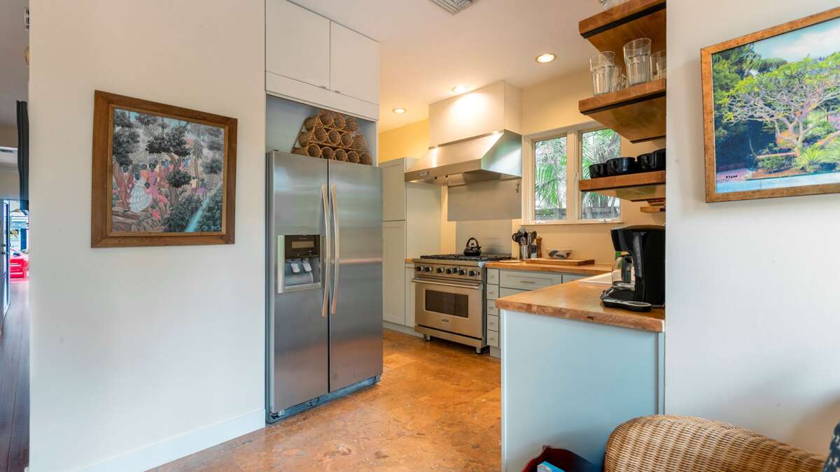 Windows are a main theme in the kitchen as throughout the home. The kitchen features a 6 burner professional Viking Range. Open shelves display colorful dishes, cups, glasses, professional knives, and Calphalon pots. The counter is a rich warm wood and provides space for preparing a meal inside. Of course, there’s also the lovely option to BBQ outside on the pool deck. A cooks dream.