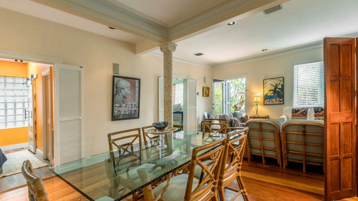 Next on the left is the dining area. The center of this area is a bamboo dining set with glass top and six cushioned chairs. Back to the left is a desk and chair centered under a three-paneled window that looks out onto lush green palm trees. The back wall of this space has a doorway that ushers into the kitchen.