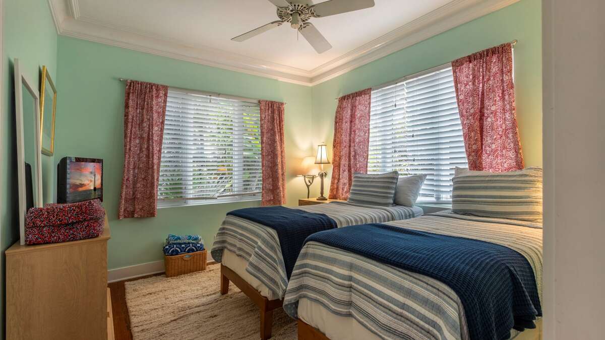 To the right side of the living area is the first of three delightful bedrooms, this front one with twin beds or set up as a king, plenty of windows, a generous closet, and a flat screen TV atop a chest of drawers. The center master bedroom has a queen bed, walk-in closet, dresser, TV, and en-suite full bath. The third, rear bedroom features a built-in full bed, dresser, option to hang clothes, and French doors out to the pool deck. The second full bathroom off the hall is shared by 2 of the bedrooms.