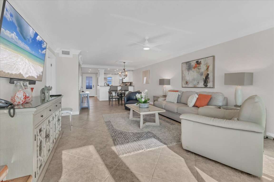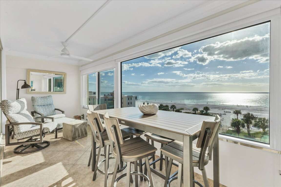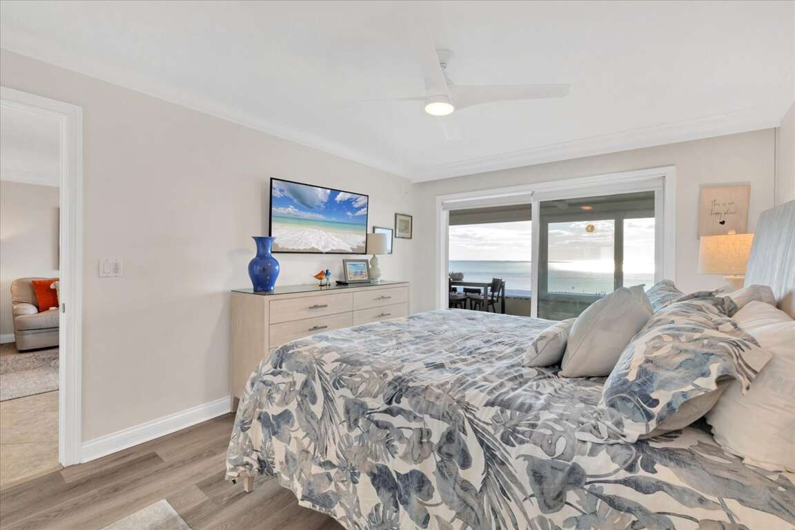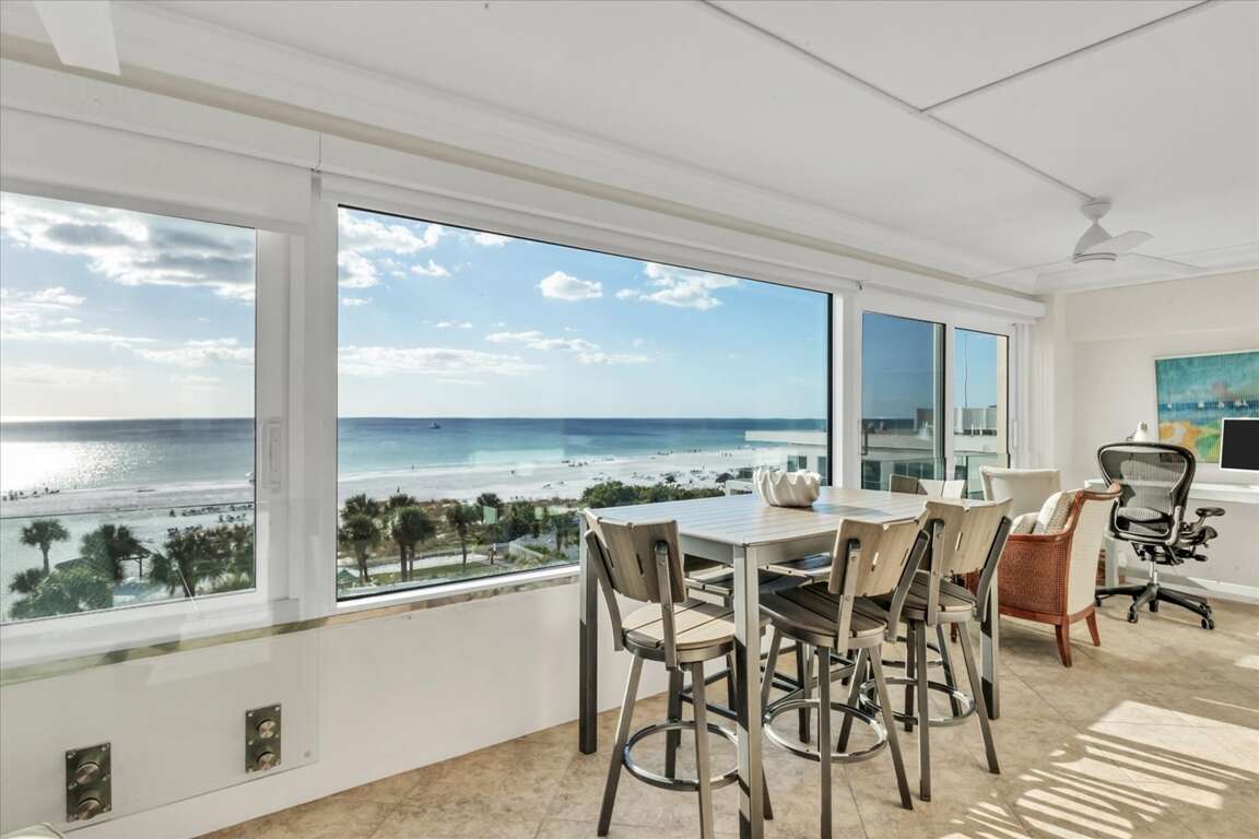 Situated along the picturesque shores of Siesta Key, this beautifully upgraded beach view condo offers a serene escape with stunning Gulf vistas, making it an ideal retreat for families and groups alike. The interior design reflects a coastal aesthetic, featuring airy spaces adorned with soothing colors and chic furnishings that enhance relaxation. Each room is thoughtfully arranged to maximize comfort, ensuring guest experiences are both enjoyable and memorable. With two spacious bedrooms accommodating up to five guests, the layout promotes both privacy and togetherness. Large windows invite natural light, creating a warm ambiance that complements the breathtaking views outside. This condo not only serves as a luxurious getaway but also as a canvas for unforgettable memories against the backdrop of Florida's enchanting coastline.