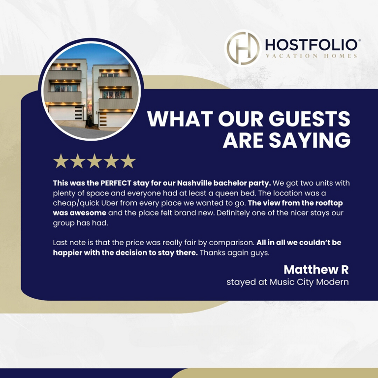 Whether you’re visiting for the music, the food, or a little bit of both, our homes are the perfect base for your Nashville adventure. With our prime location, stunning rooftop views, and trendy vibe, your group will feel right at home. We can’t wait to host you!