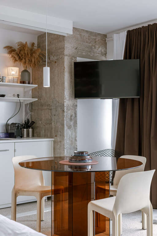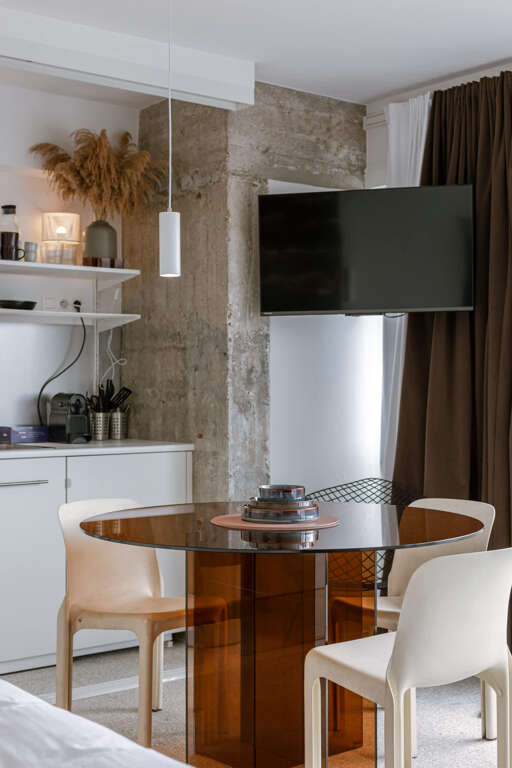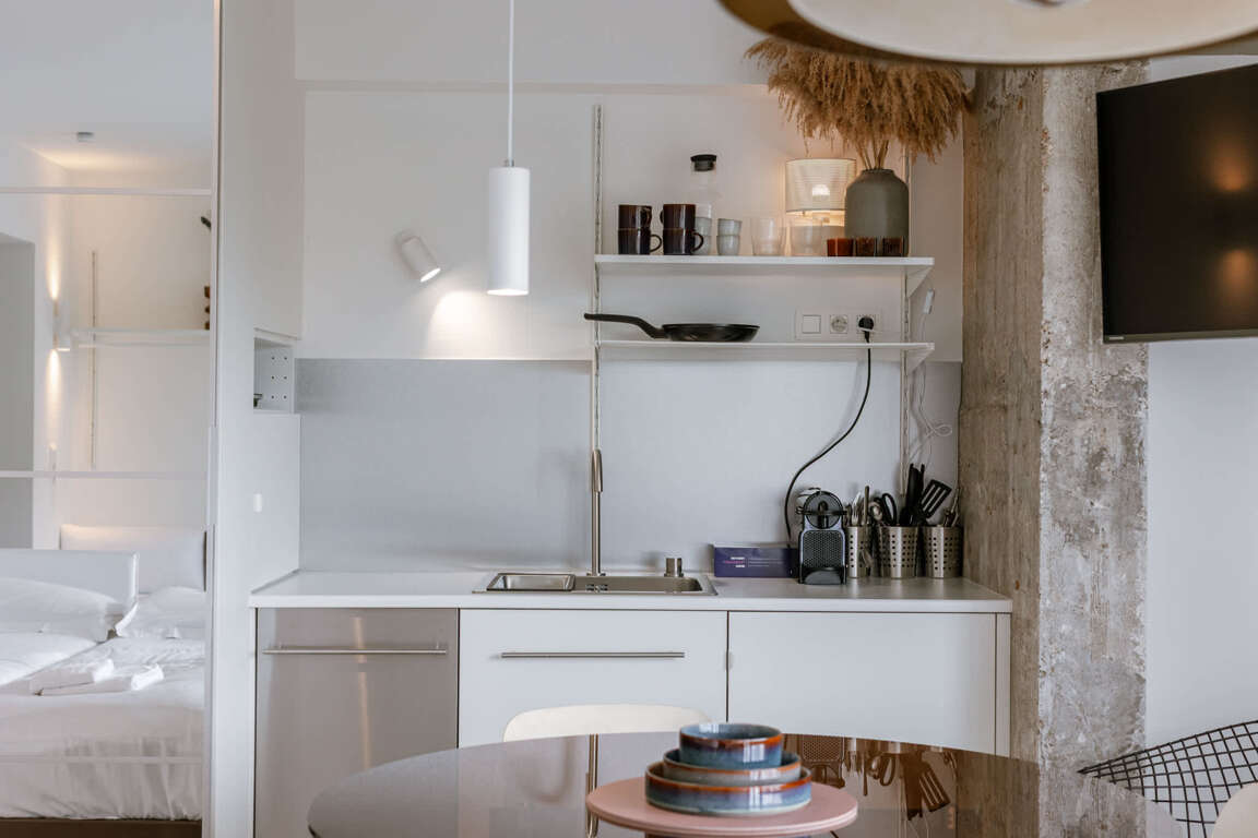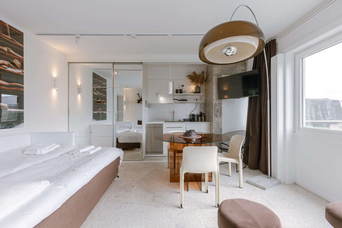 Modern short-term vacation rental by Huswell - Studio 14. Ultimate comfort guaranteed by high-end amenities: Dishwasher, Washer/Dryer, Internet Access, and Television.