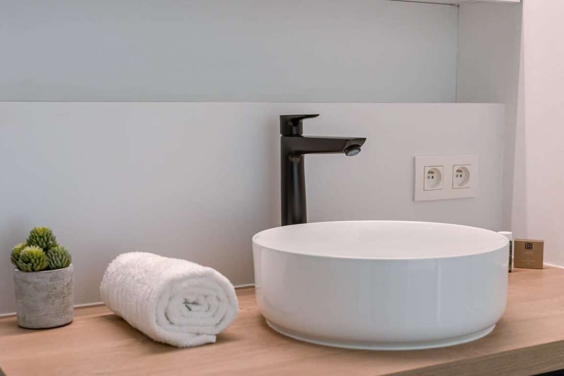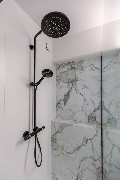 A contemporary bathroom with a walk-in shower completes the space, providing all the essentials for a comfortable stay. With on-site parking, a fresh and clean interior, and sweeping seaside scenery, every detail is designed to make you feel at ease.