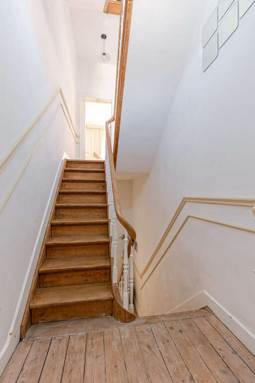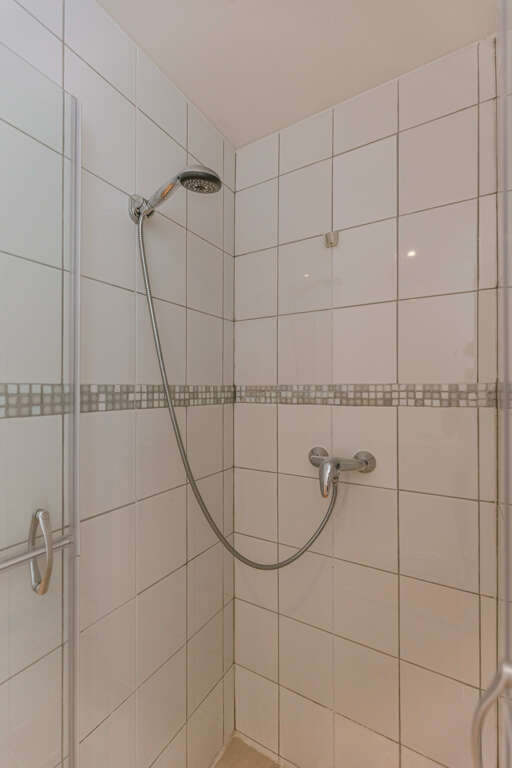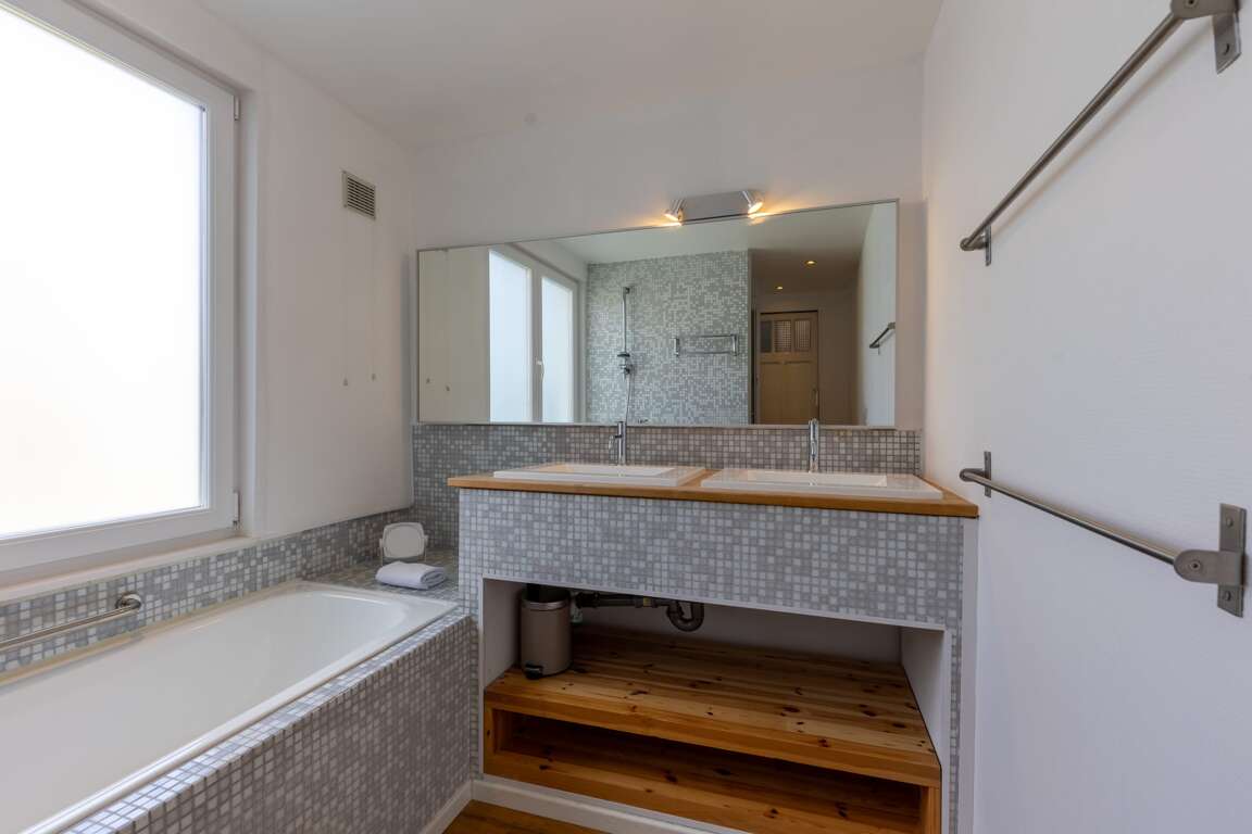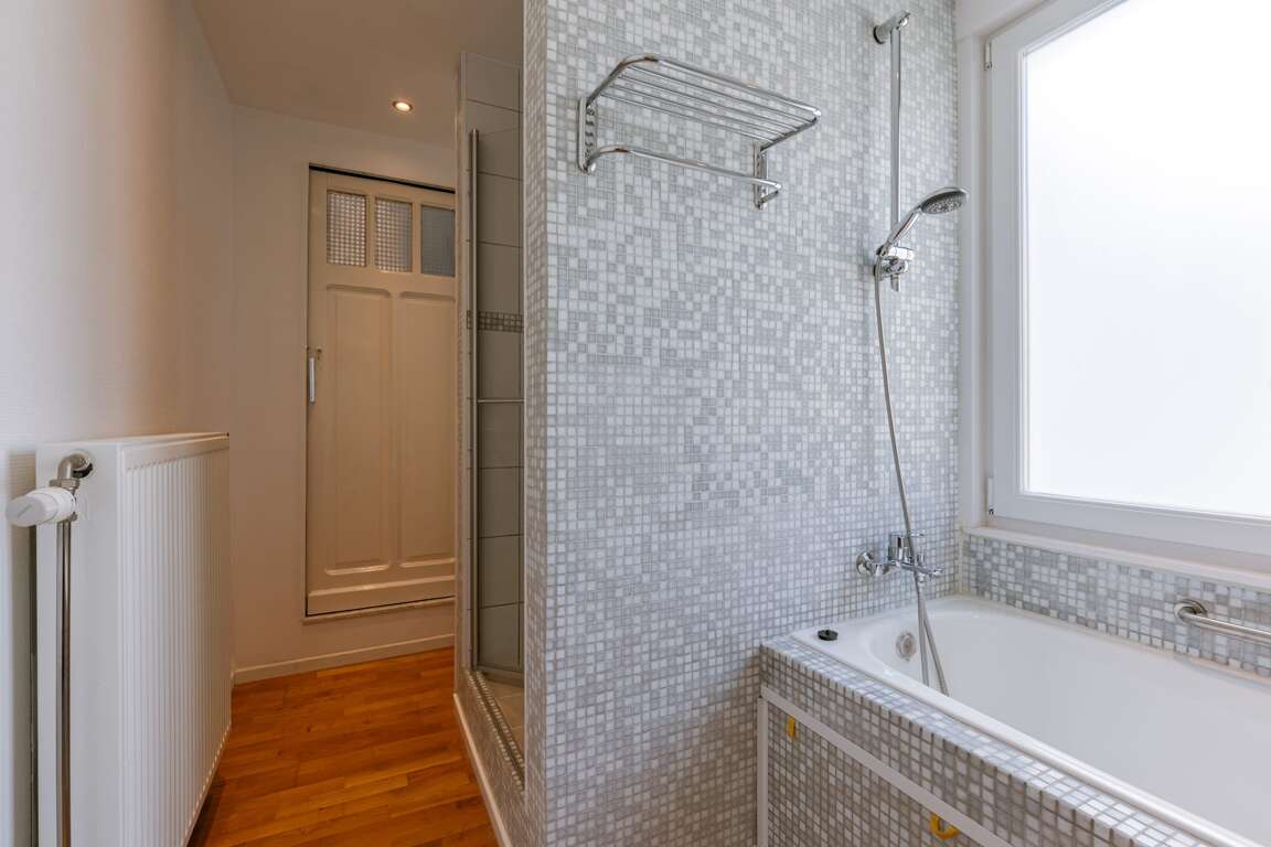 - Modern bathroom with both a bathtub and a shower located between the second and third floors