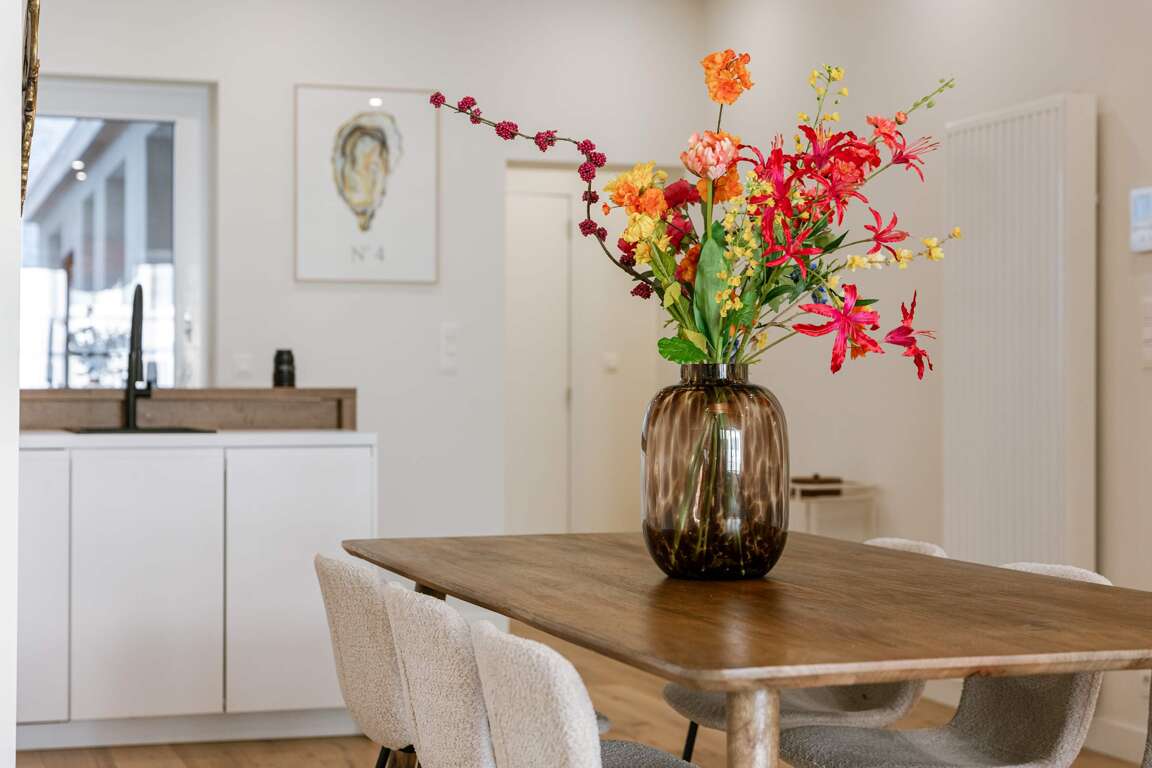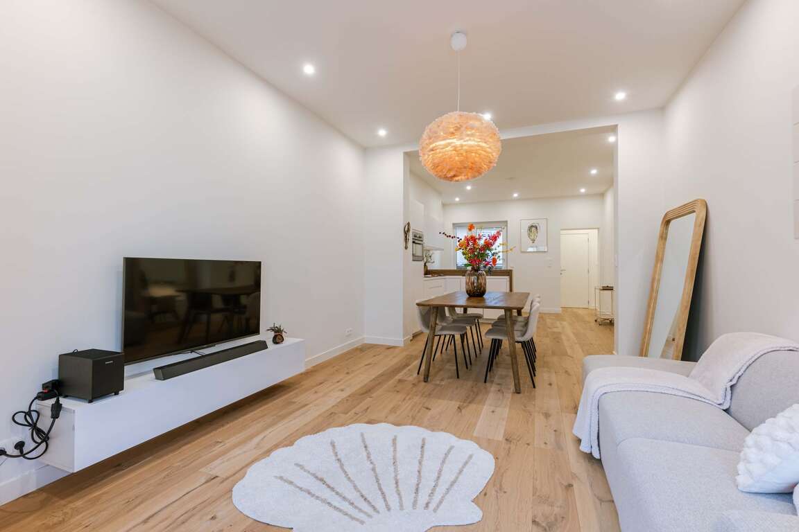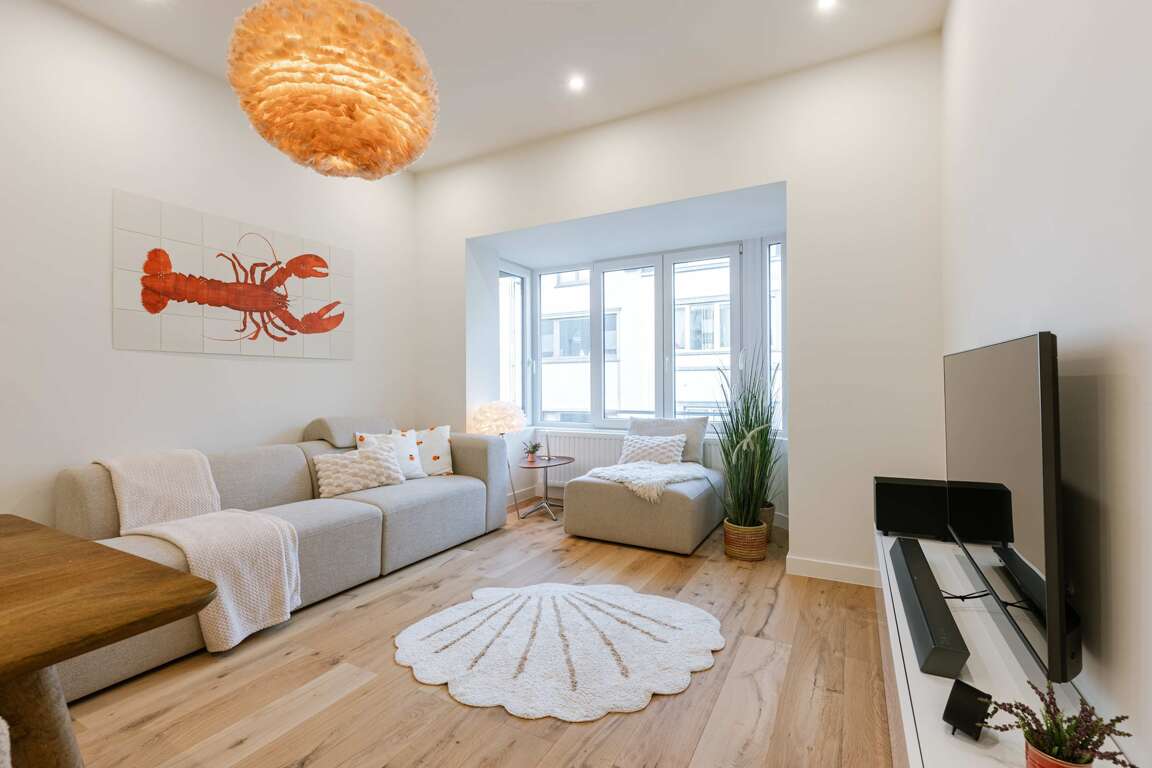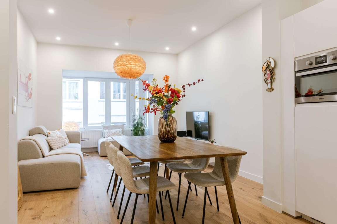 The open-plan living area includes a kitchen with a breakfast nook and a cozy dining table, ideal for enjoying meals together. The apartment is well-equipped for families, with a foldable crib, high chair, and child-friendly dishes. This bright and welcoming apartment in the heart of Ostend is perfect for families or groups, comfortably accommodating up to 7 guests.