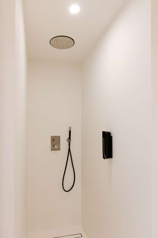 - Modern bathroom with a sleek walk-in shower for convenience and comfort