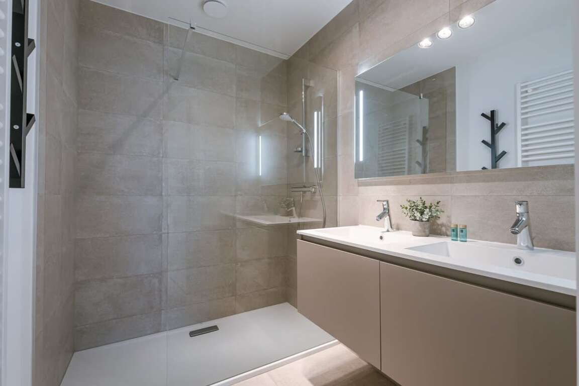 - Modern bathroom with a walk-in shower that offers a spa-like experience