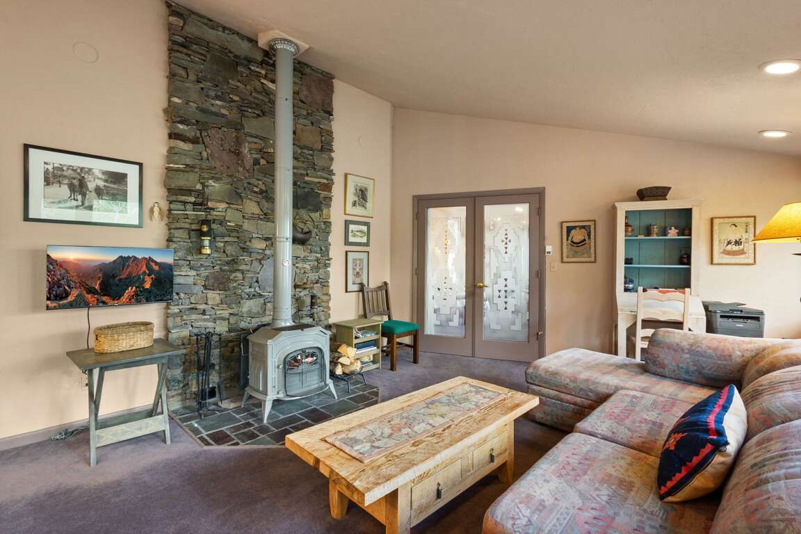 - Tranquil setting, wood stove, and antique Art Deco chandelier in the dining area.