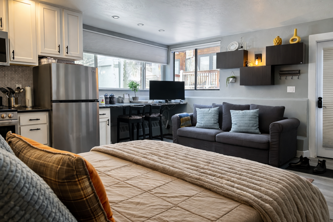 <span style="font-size:12pt"><span style="font-family:Aptos,sans-serif"><span style="color:black">Step into a studio that’s been lovingly spruced up to capture that classic Telluride vibe: rustic touches meet fresh, modern updates, creating a space that’s as inviting as a mug of hot cocoa after a day in the snow. With an open layout, this studio feels roomy and relaxed, featuring a plush queen bed for two and a snuggly sofa sleeper for your extra adventurers—whether you’re rolling in with family, friends, or just your favorite travel buddy. </span></span></span><br />