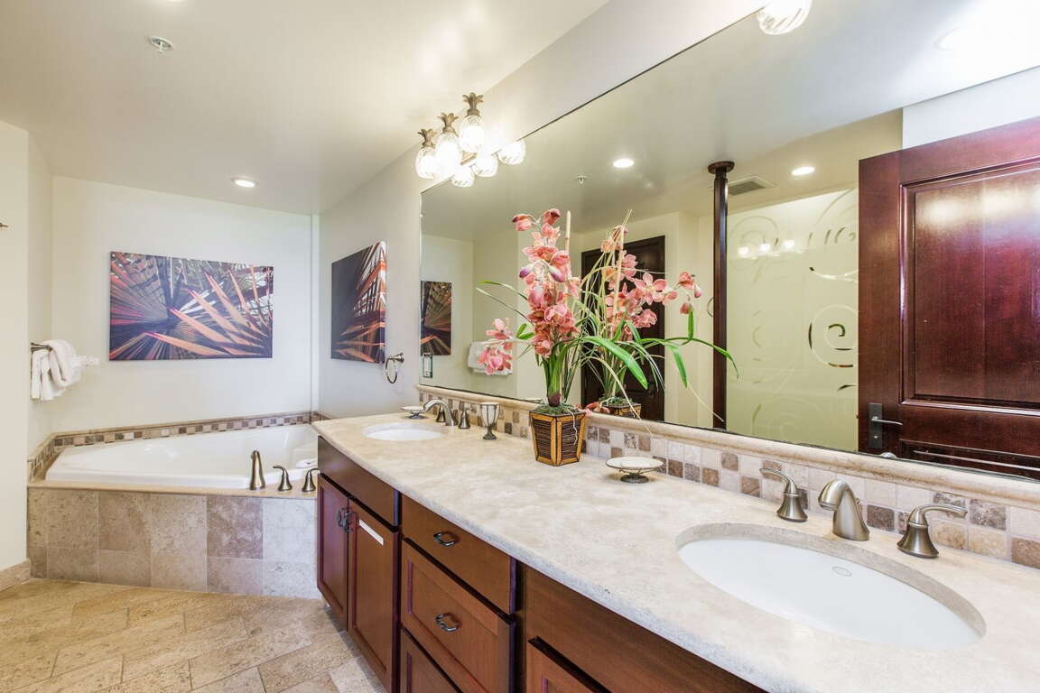 Three full bathrooms with Peruvian Travertine stone surrounds, soaking tubs and two showers. There are two master suites a King bed in one master suite, and a Queen bed in the second master suite, plus a Queen sleeper sofa in the living room to easily accommodate 6 people. G302 includes three flat panel wall mounted televisions, central air conditioning, elevator access, and interior full size stackable washer and dryer.