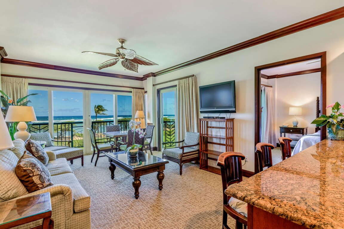 Gorgeous Oceanfront Waipouli Beach Resort G302, one of Waipouli Beach Resort's most desirable Ocean Front suites, offers spectacular 180 degree unobstructed ocean and sandy beach views. You can see the ocean from every room! Fall asleep to the sound of the waves every night! Located on the quiet side of the resort overlooking the serene cultural preserve, the view is yours to enjoy from each of the three lanais.