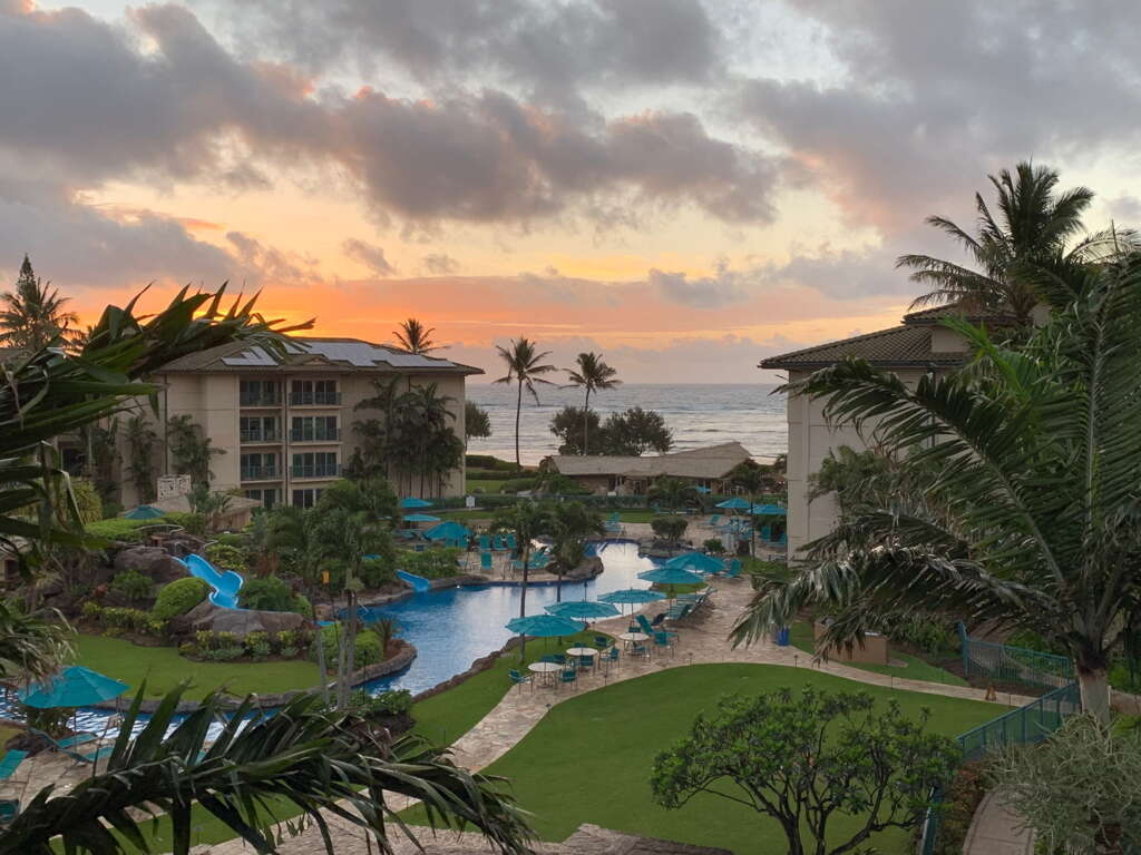 Waipouli Beach Resort & Spa features breathtaking beach sunrises, a state of the art lazy river pool complete with water slides, waterfalls, hot tubs, sandy bottom children's pool, beautiful tropical landscaping lit up at night with tiki torches, a spa, and beach restaurant.
