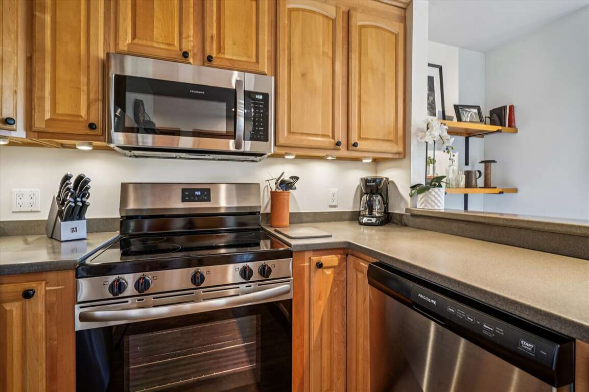 Stay connected with high-speed internet and two designated workspaces, ideal for remote work or school. Show off your culinary skills in the fully stocked kitchen, complete with brand-new appliances (as of summer 2024). The open-concept living area invites you to curl up by the fireplace, whether you’re enjoying a book, a board game, or a movie night with family and friends. Three flat-screen TVs throughout the condo provide cable and access to your favorite streaming channels.