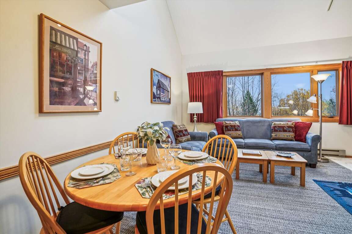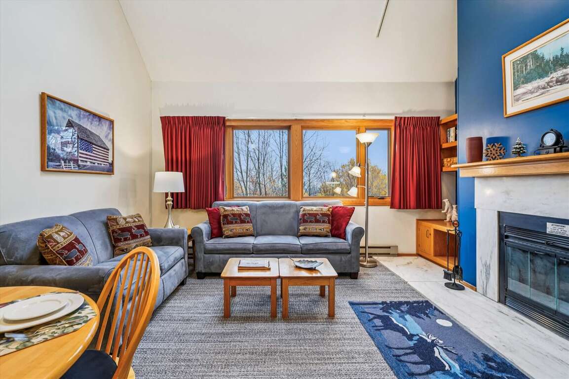 With an inviting living room featuring a wood-burning fireplace and a flat-screen TV, a fully equipped kitchen, and a dining area, the luxurious Highridge Condo Unit E10 offers a perfect blend of comfort and elegance for a memorable vacation experience.