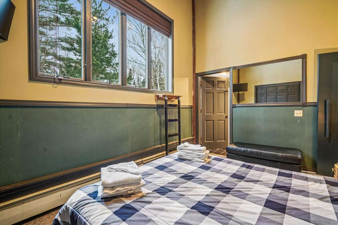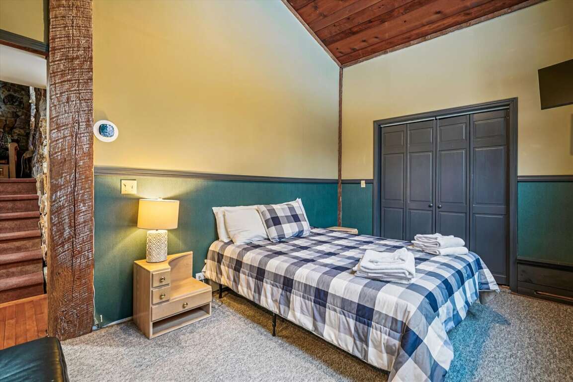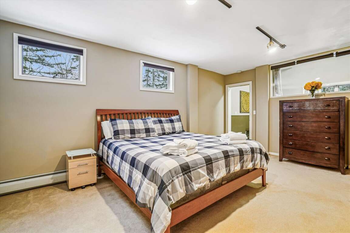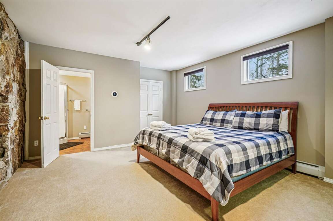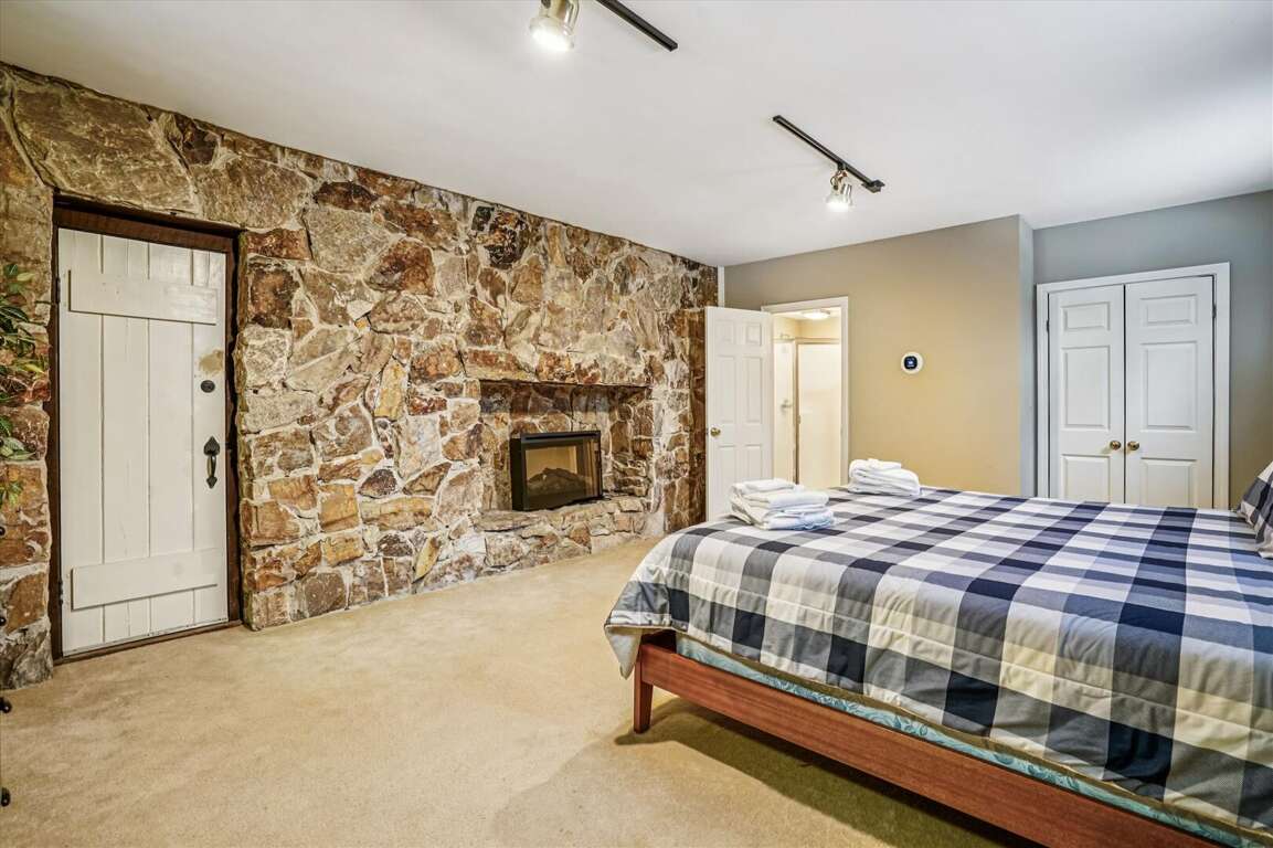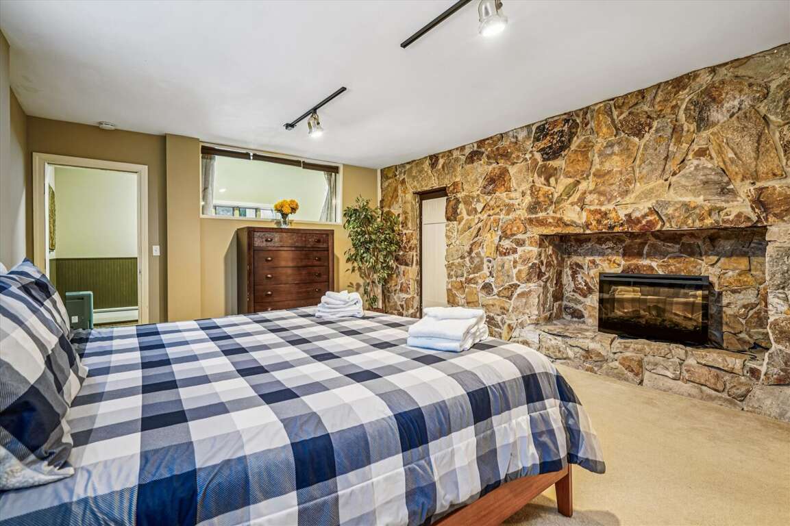 The lower level boasts a luxurious king bedroom complete with an electric fireplace and an attached bathroom, creating a cozy retreat for restful nights.