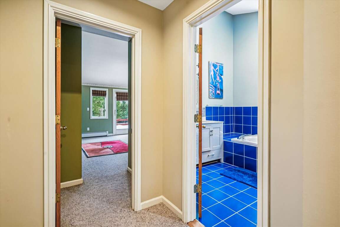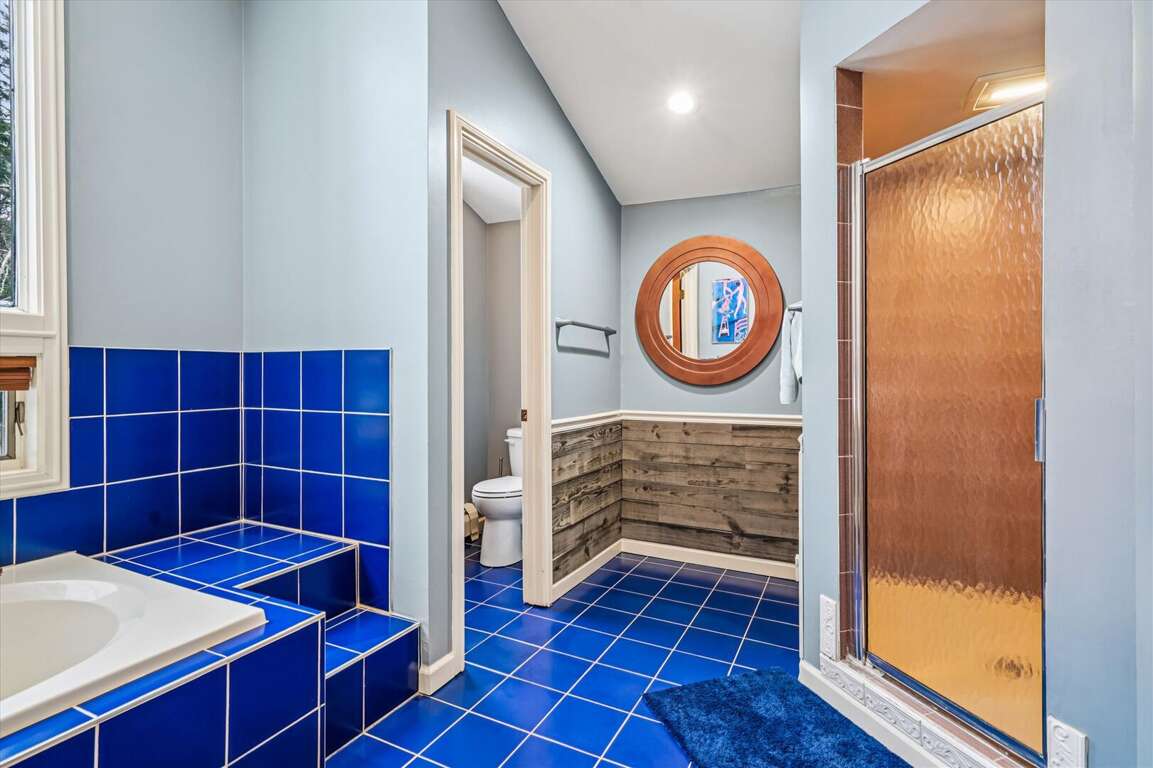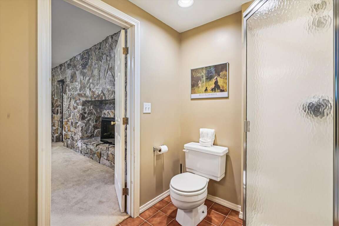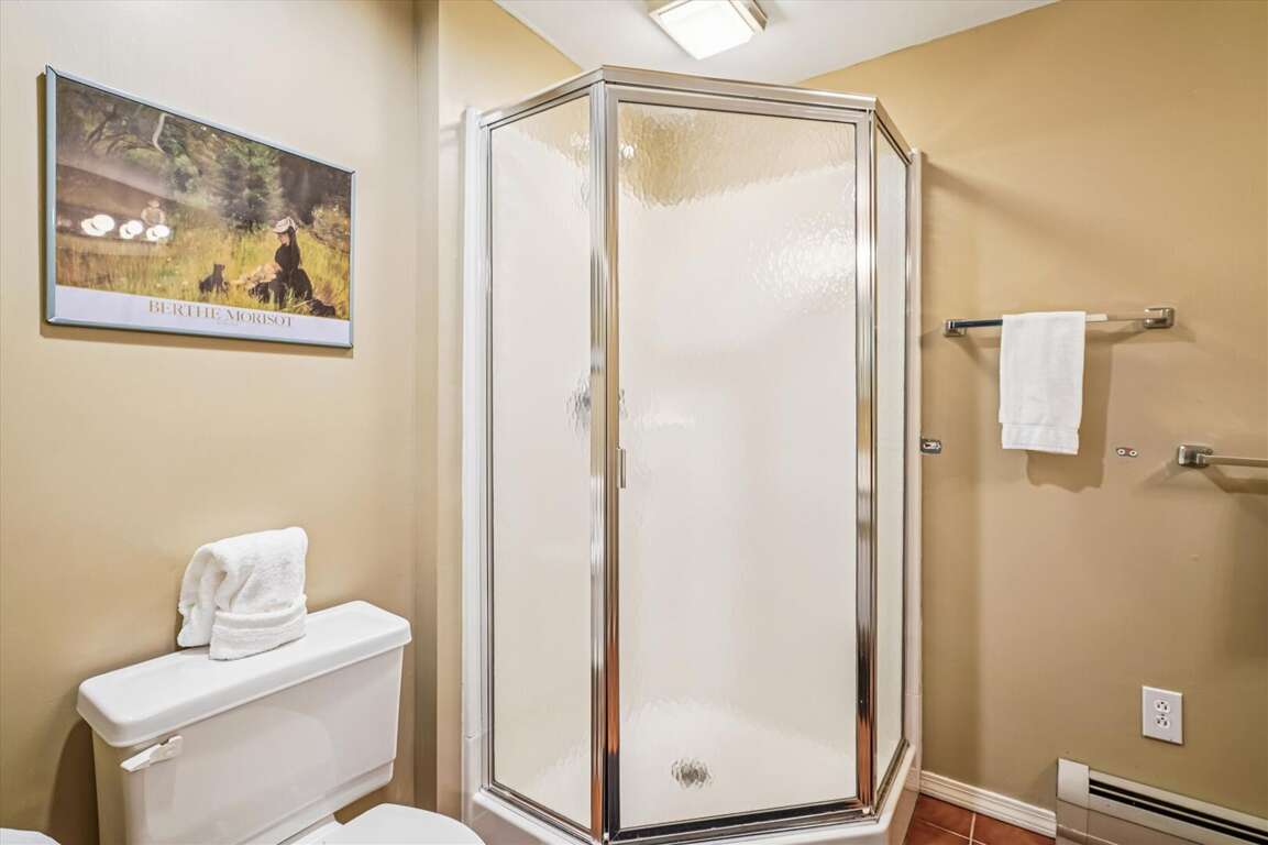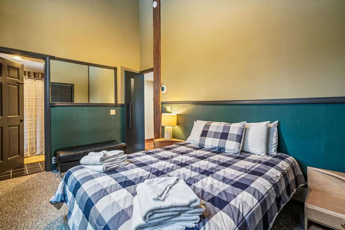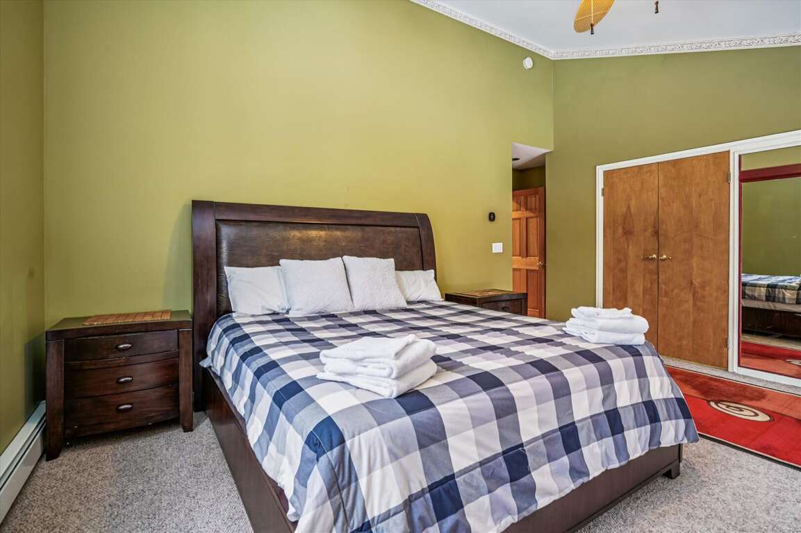 The lower level boasts a luxurious king bedroom complete with an electric fireplace and an attached bathroom, creating a cozy retreat for restful nights.