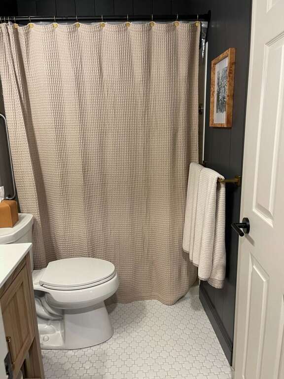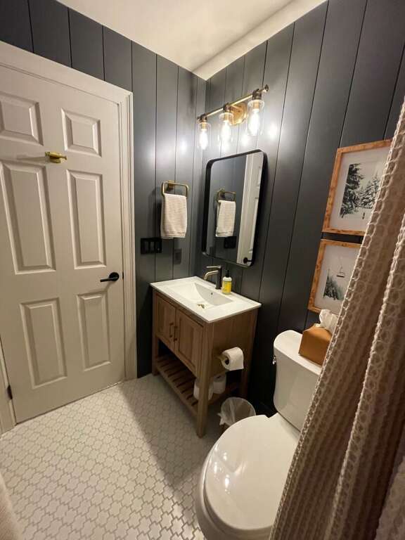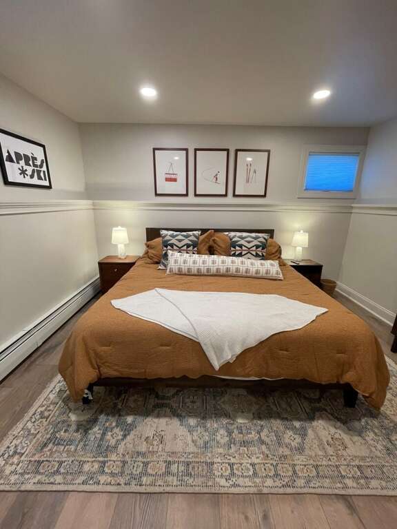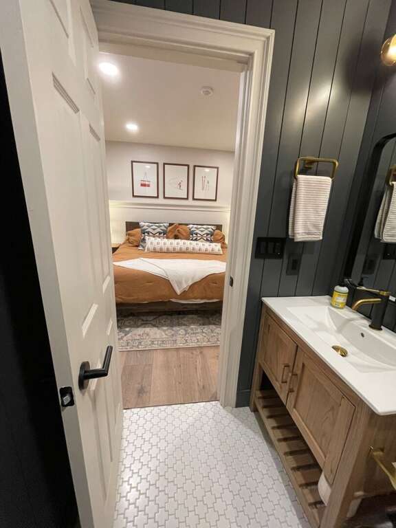 Both full bathrooms feature walk-in showers, offering modern design and convenience for busy ski days.