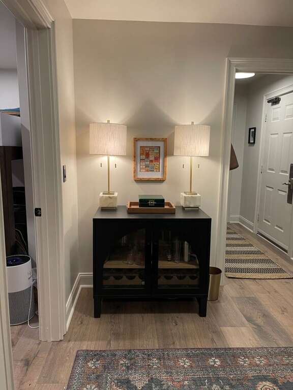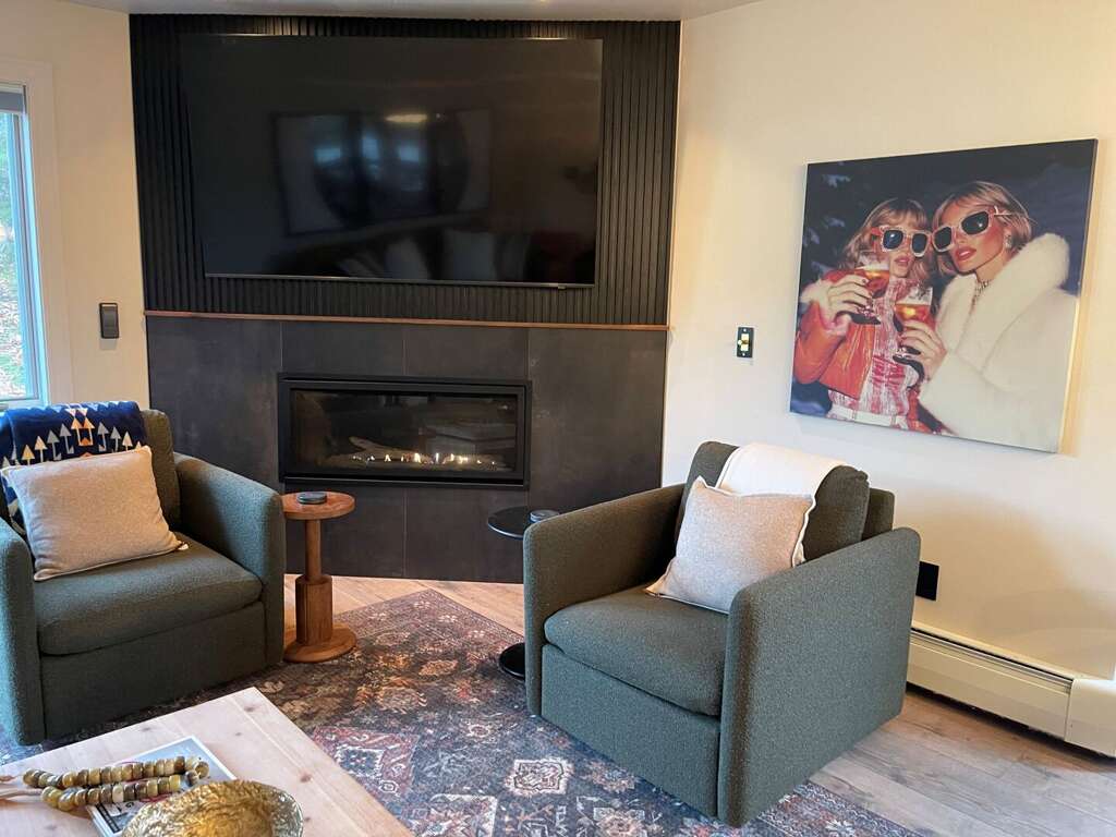 The open living area features a gas fireplace and a 55" streaming-only TV, creating the perfect spot to relax after a day on the slopes. The chef’s kitchen is equipped with top-of-the-line appliances, including a drip coffee maker, espresso machine, dishwasher, and toaster. Everything you need for effortless meals and cozy mornings.