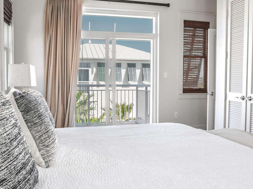 The oversized bedroom features a king size bed and its own private balcony with