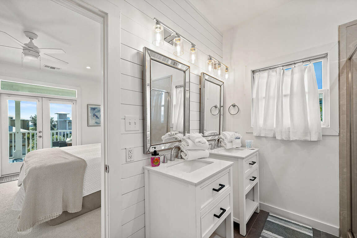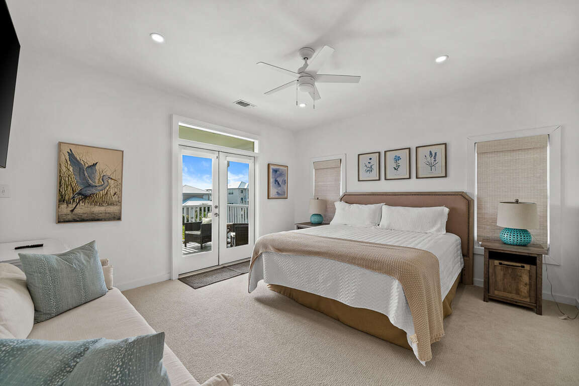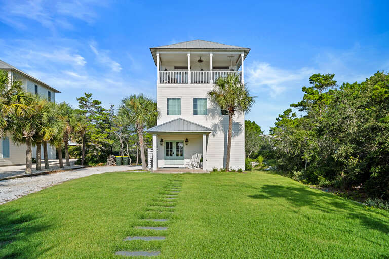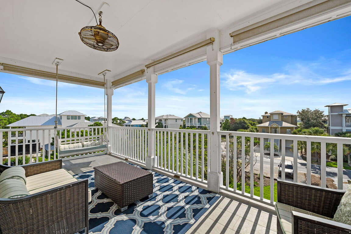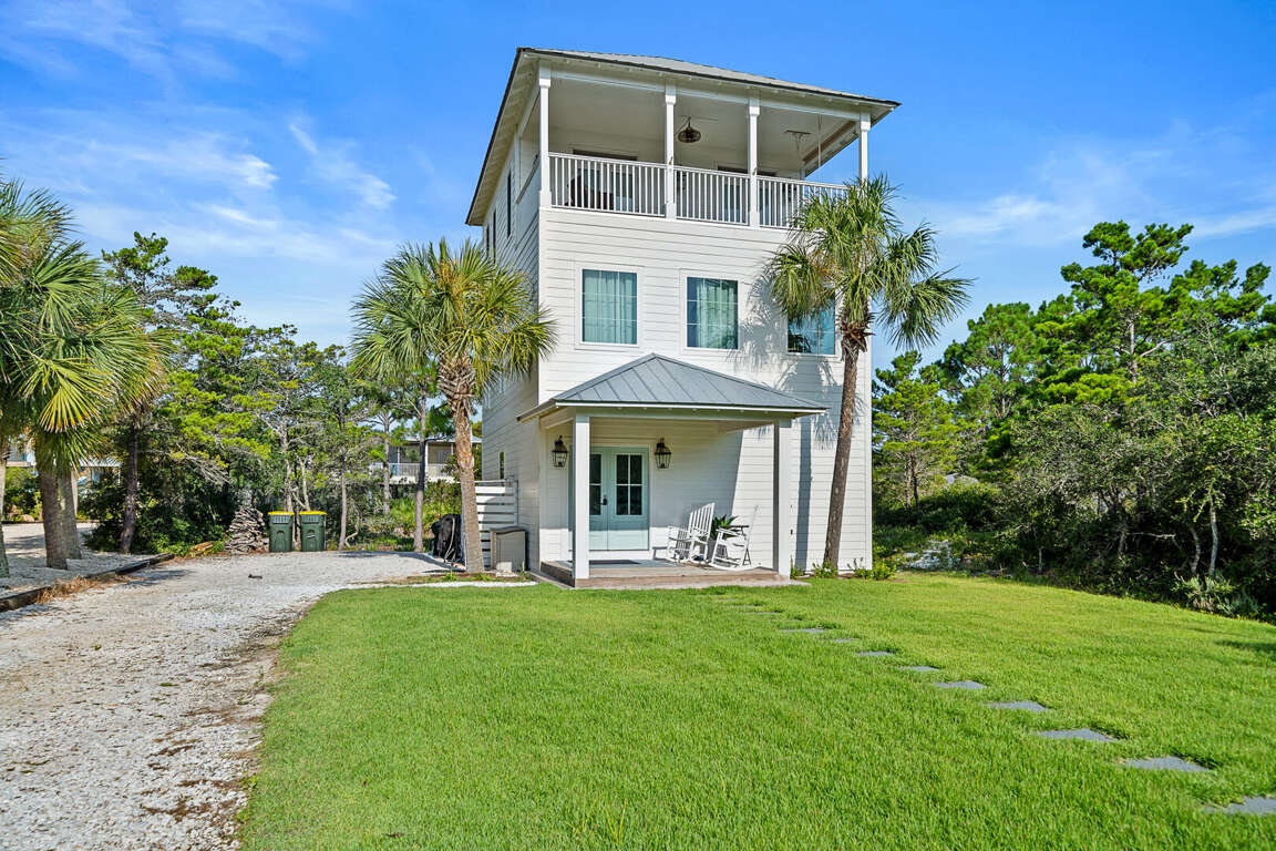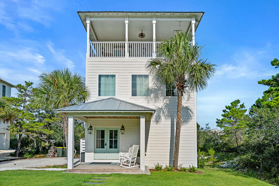Three-level house in Gulf Shores with 3 bedrooms, sleeps 8, plus porch seating, ping pong, and seasonal shuttles to the beach club and amenities.