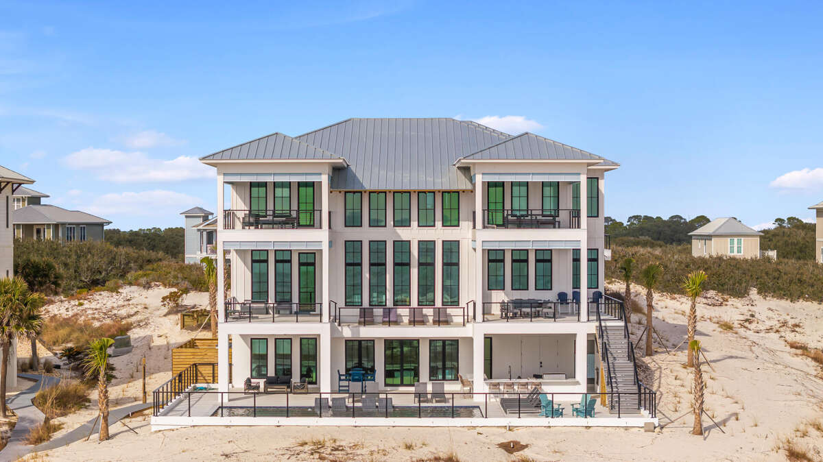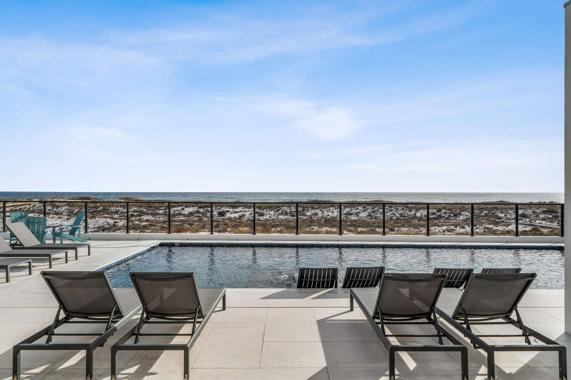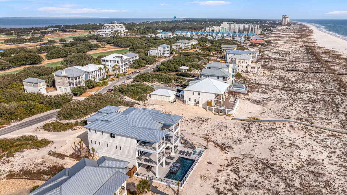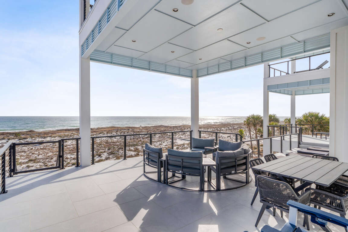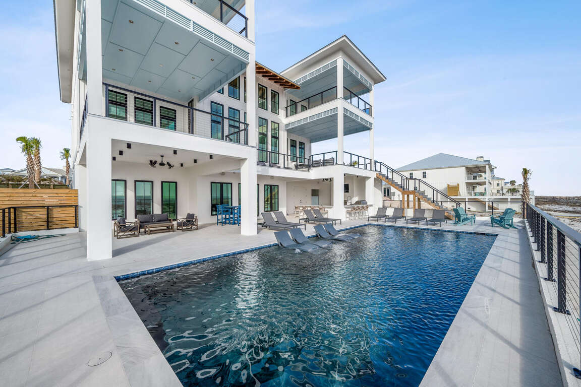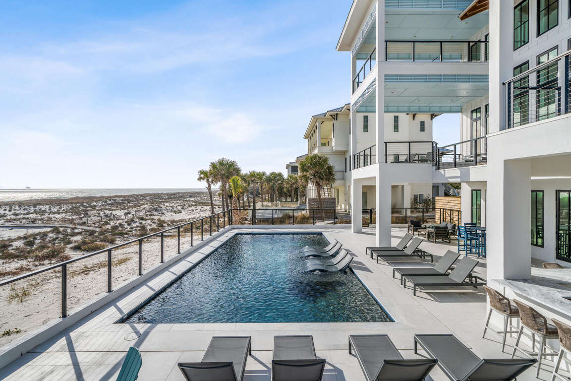 Totally Beachin’ is finally here! This direct beachfront new construction home was just completed in early 2025 and has it all! From the moment you enter the home on the 2nd floor level, you are immediately struck by the breathtaking two story views of the gulf from the family room. The 5 bedroom, 6 and 1/2 bath property comes with 3 king bedrooms and en-suite bathrooms on each of the 3 levels all with large decks giving you direct, unobstructed views of the ocean. It has 1 queen bedroom on the front side of the home with views of the golf course and bay and 1 bunkroom complete with two queen beds on the bottom and two twin beds on top. The first floor comes complete with a game room, arcade room with gaming system, ping pong table and a very large movie theater room. Head out on to the first floor deck and experience the outdoor living, bar and grill area, outdoor shower and stunning swimming pool with direct views of the Gulf. From the 1st floor deck, step onto a private walking path that takes you straight to the beach. The home comes equipped with a full scale kitchen, complete with two islands and a dining room table. There are washer and dryer sets on both the 1st and 2nd floors, multiple refrigerators and wine refrigerators in the kitchen and first floor game room. There are coffee stations on all three levels and an elevator that services all floors of the home.