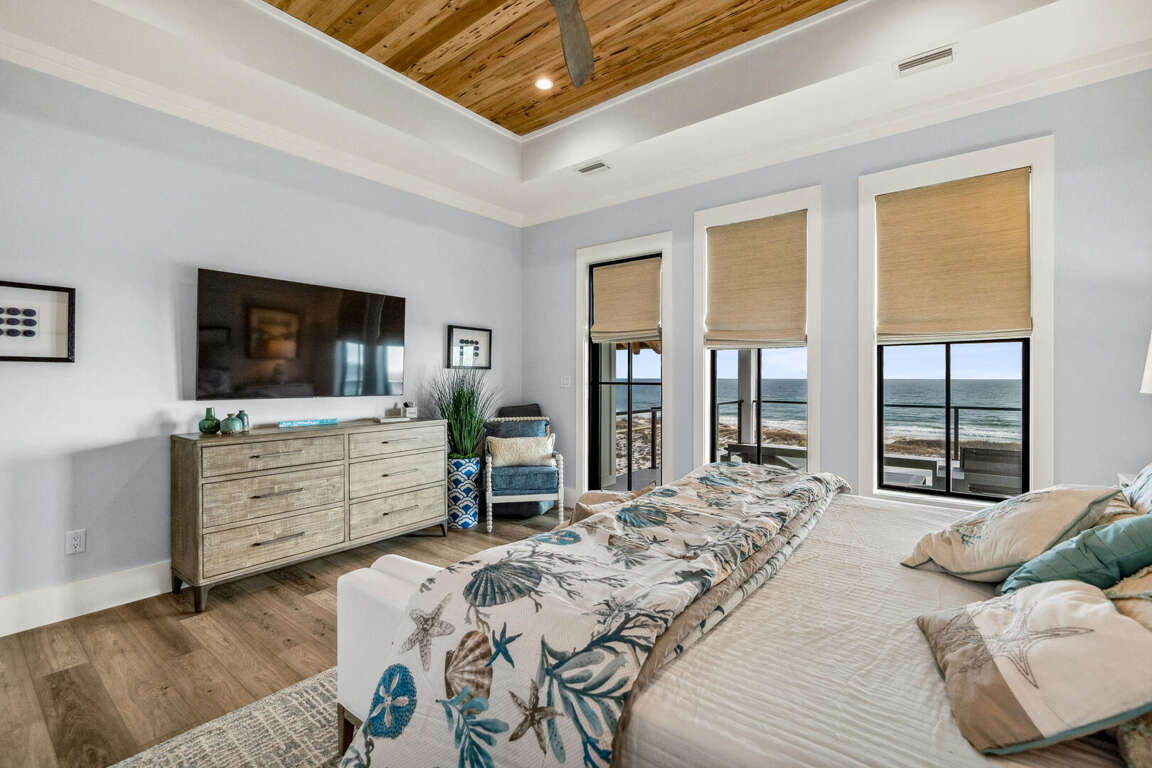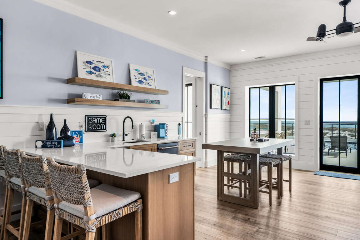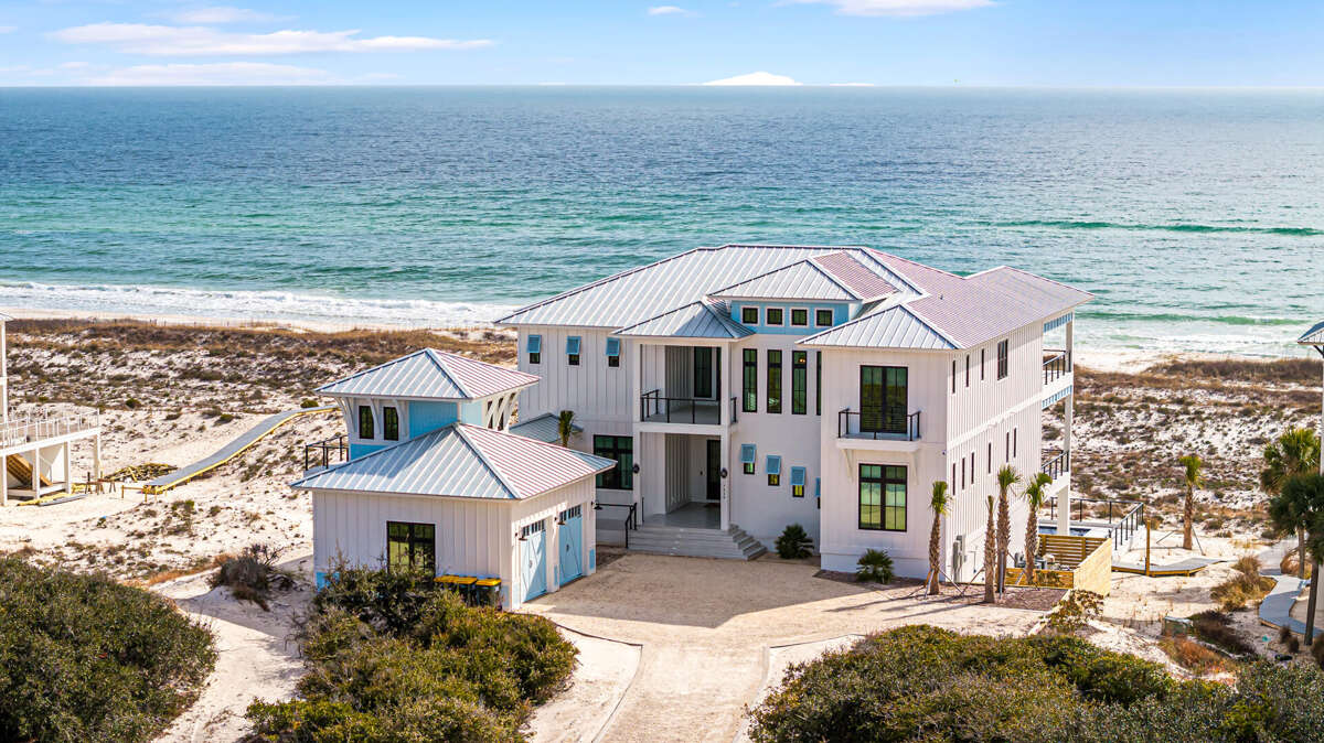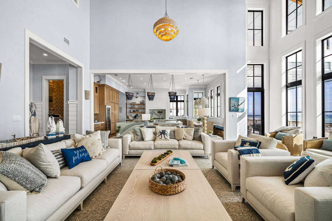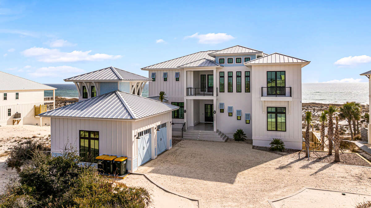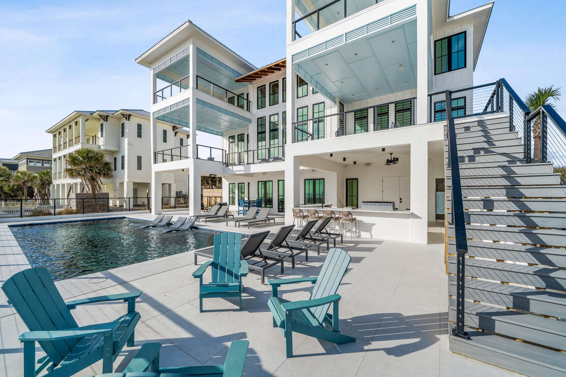 Totally Beachin’ is finally here! This direct beachfront new construction home was just completed in early 2025 and has it all! From the moment you enter the home on the 2nd floor level, you are immediately struck by the breathtaking two story views of the gulf from the family room. The 5 bedroom, 6 and 1/2 bath property comes with 3 king bedrooms and en-suite bathrooms on each of the 3 levels all with large decks giving you direct, unobstructed views of the ocean. It has 1 queen bedroom on the front side of the home with views of the golf course and bay and 1 bunkroom complete with two queen beds on the bottom and two twin beds on top. The first floor comes complete with a game room, arcade room with gaming system, ping pong table and a very large movie theater room. Head out on to the first floor deck and experience the outdoor living, bar and grill area, outdoor shower and stunning swimming pool with direct views of the Gulf. From the 1st floor deck, step onto a private walking path that takes you straight to the beach. The home comes equipped with a full scale kitchen, complete with two islands and a dining room table. There are washer and dryer sets on both the 1st and 2nd floors, multiple refrigerators and wine refrigerators in the kitchen and first floor game room. There are coffee stations on all three levels and an elevator that services all floors of the home.