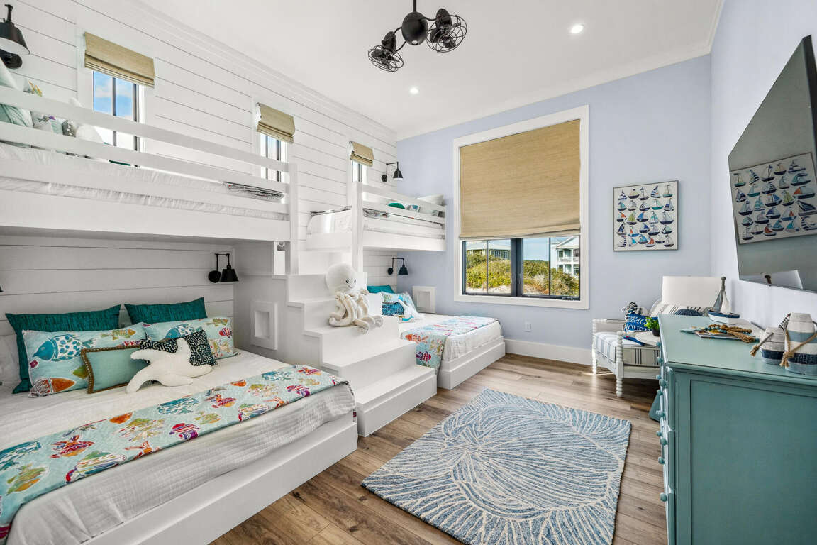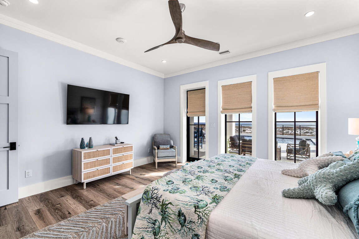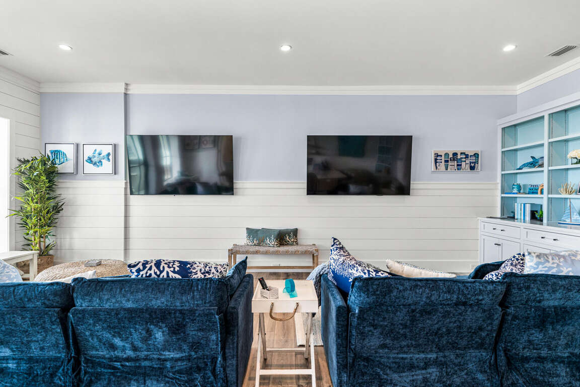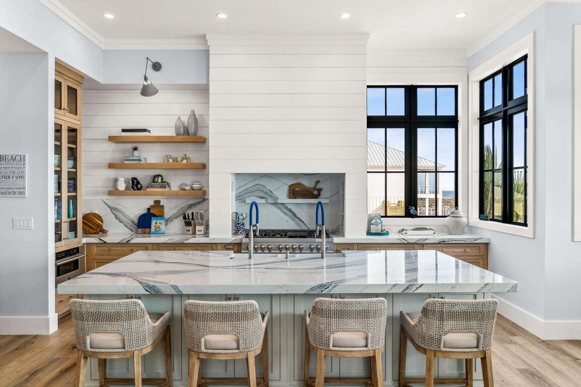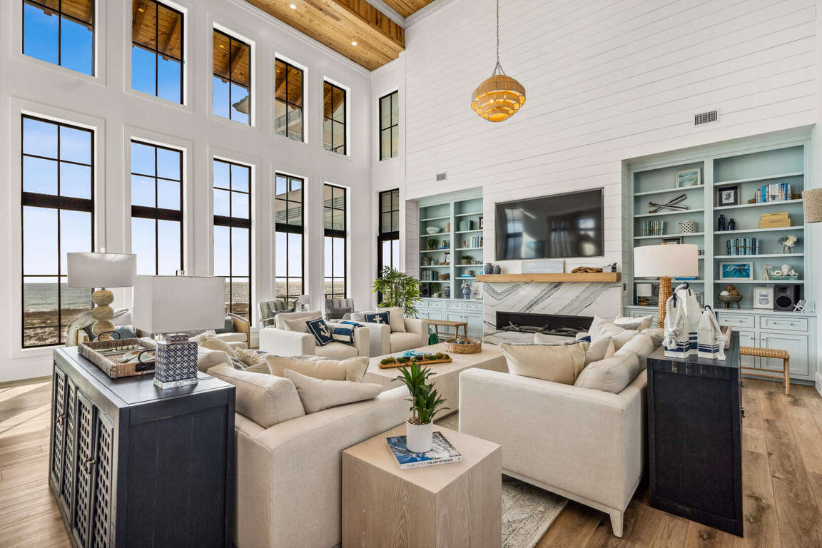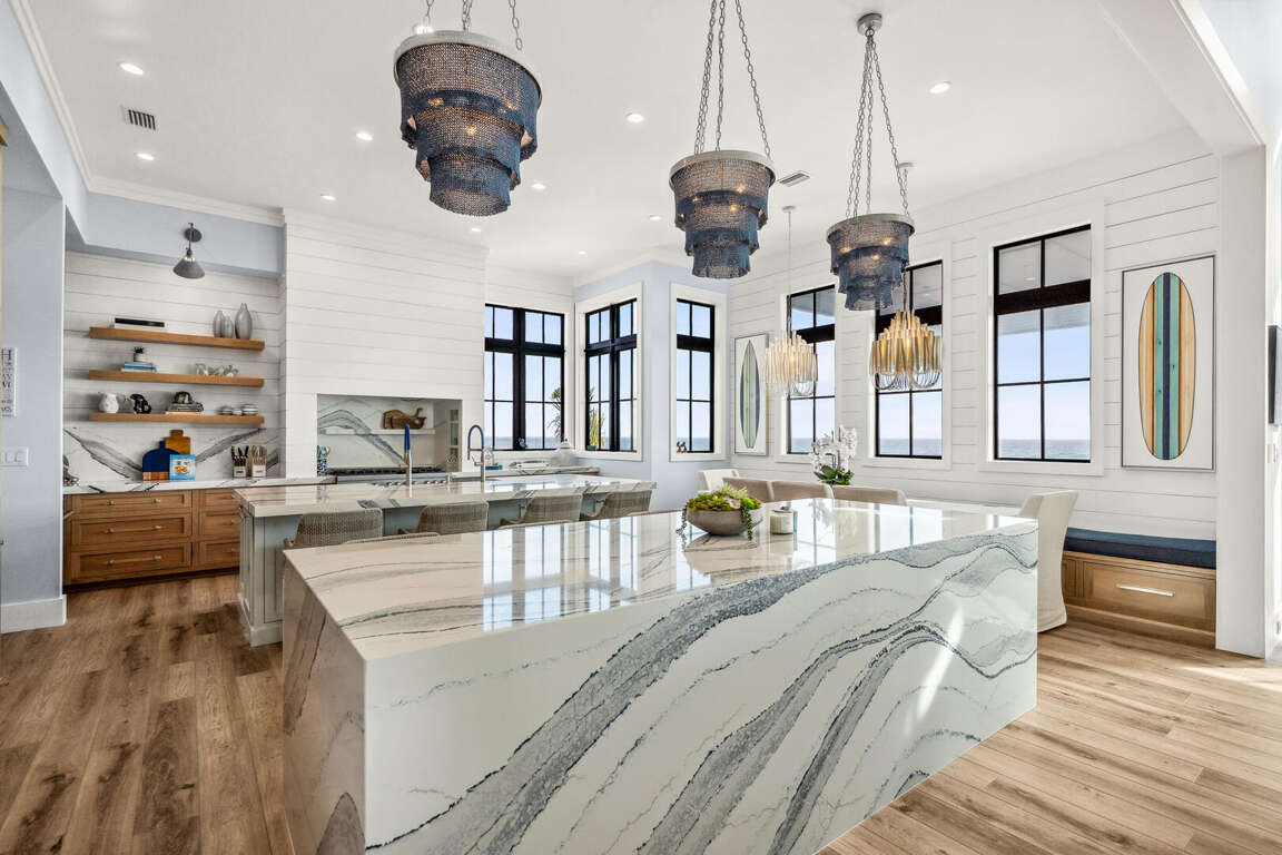 Totally Beachin’ is finally here! This direct beachfront new construction home was just completed in early 2025 and has it all! From the moment you enter the home on the 2nd floor level, you are immediately struck by the breathtaking two story views of the gulf from the family room. The 5 bedroom, 6 and 1/2 bath property comes with 3 king bedrooms and en-suite bathrooms on each of the 3 levels all with large decks giving you direct, unobstructed views of the ocean. It has 1 queen bedroom on the front side of the home with views of the golf course and bay and 1 bunkroom complete with two queen beds on the bottom and two twin beds on top. The first floor comes complete with a game room, arcade room with gaming system, ping pong table and a very large movie theater room. Head out on to the first floor deck and experience the outdoor living, bar and grill area, outdoor shower and stunning swimming pool with direct views of the Gulf. From the 1st floor deck, step onto a private walking path that takes you straight to the beach. The home comes equipped with a full scale kitchen, complete with two islands and a dining room table. There are washer and dryer sets on both the 1st and 2nd floors, multiple refrigerators and wine refrigerators in the kitchen and first floor game room. There are coffee stations on all three levels and an elevator that services all floors of the home.
