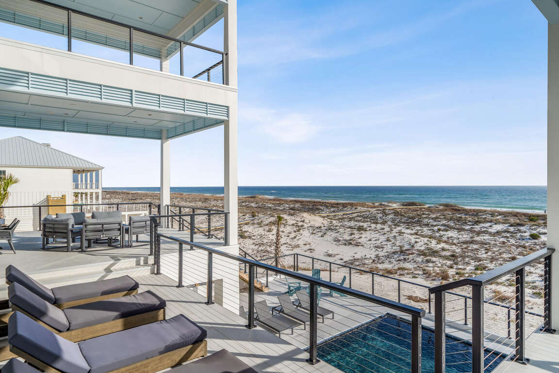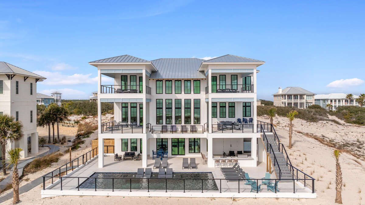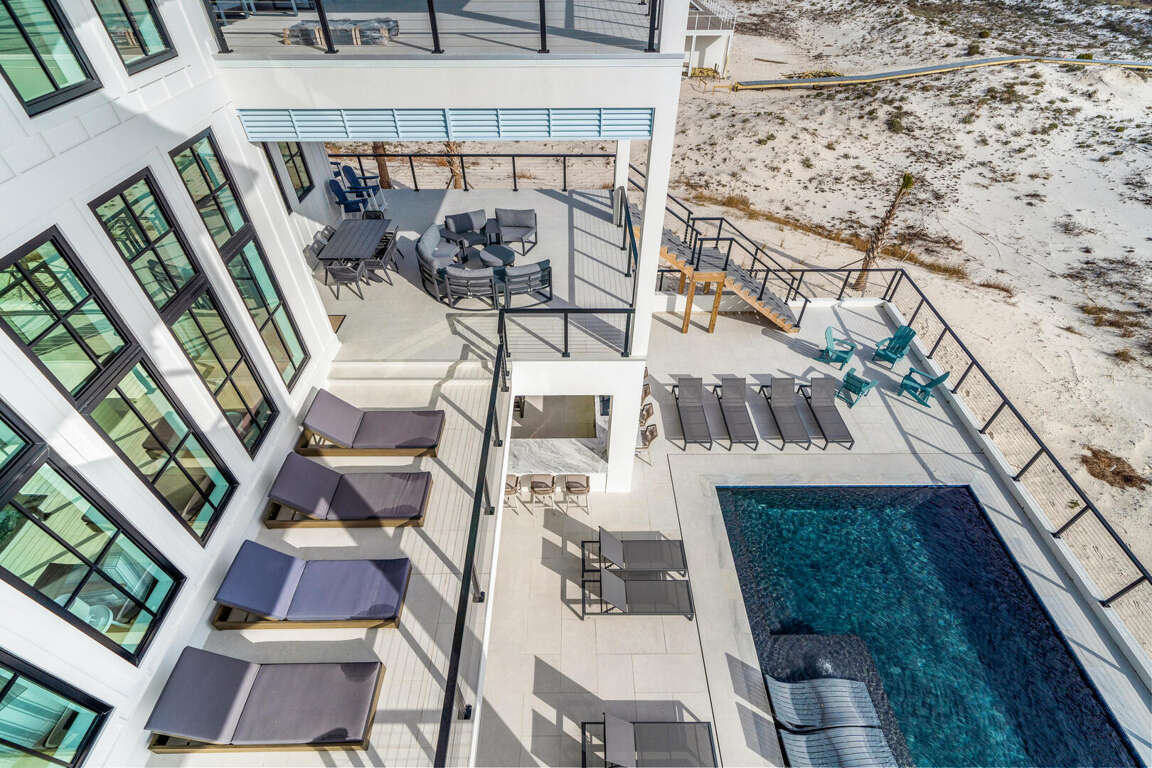 Direct beachfront house in Gulf Shores with 5 bedrooms, pool, elevator, theater room, game and arcade spaces, plus a private path leading to the beach.