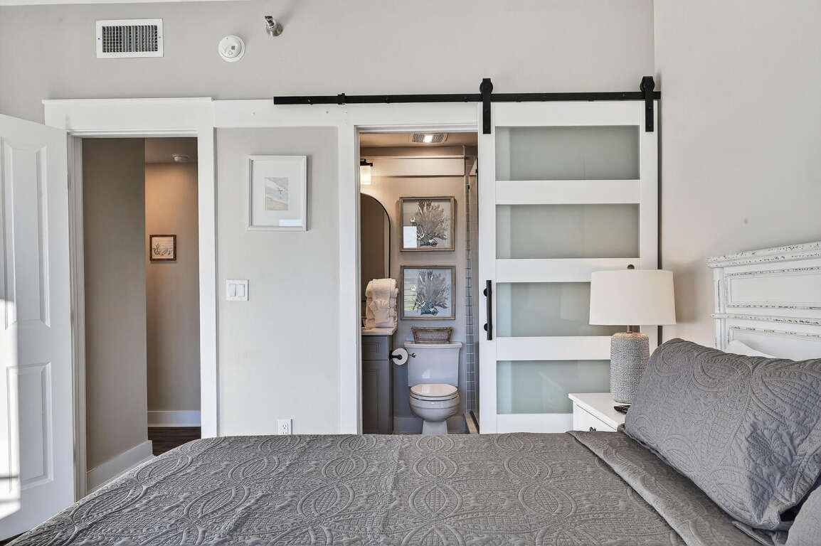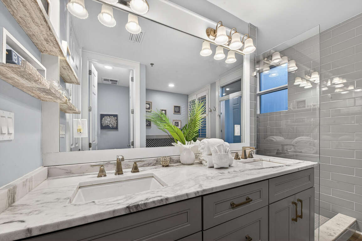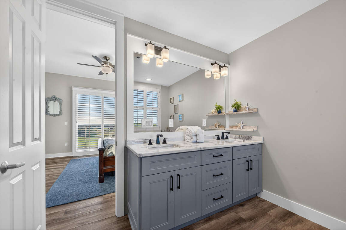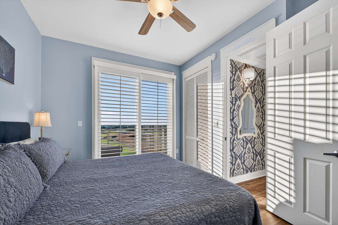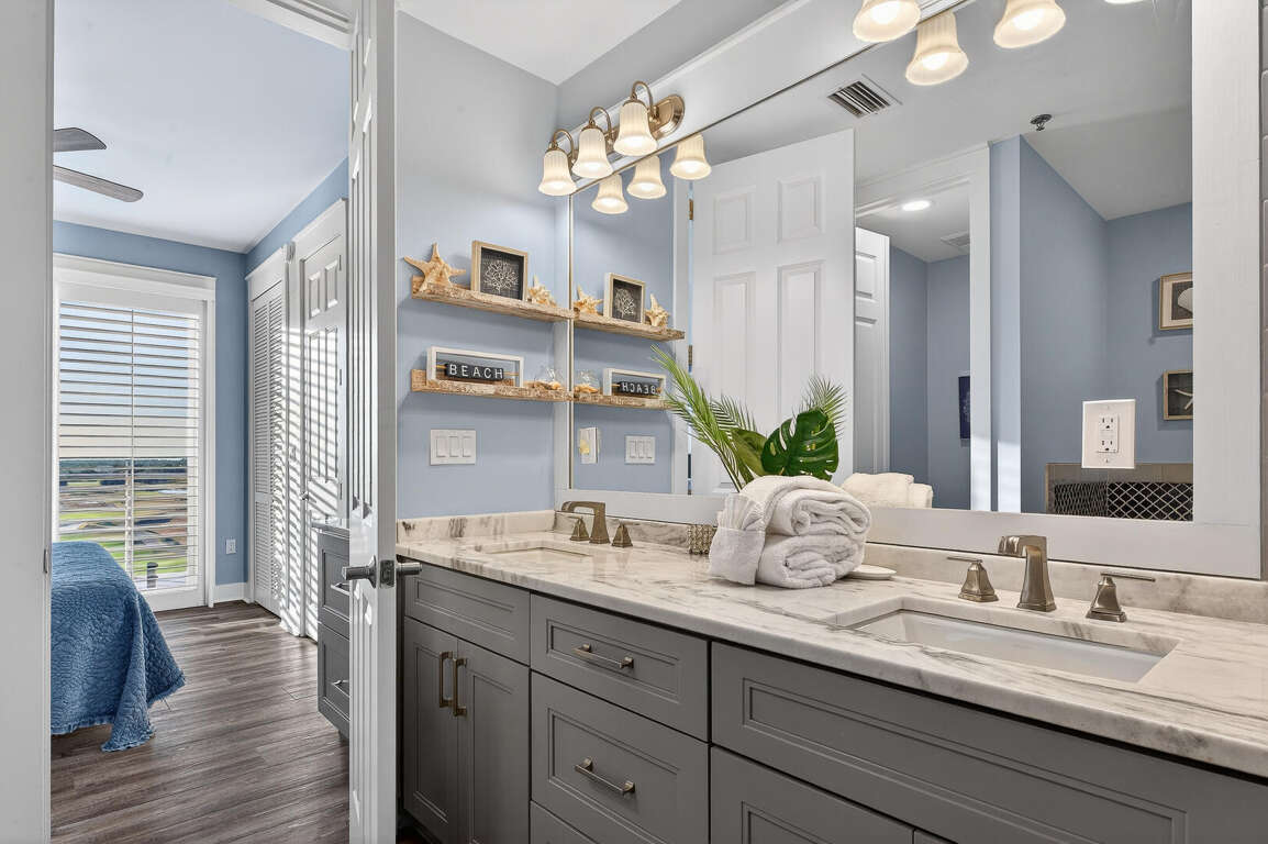 Stay in the heart of Kiva Resort by booking Kiva Lodge 604! This two-story penthouse unit features 4 bedrooms each with in-suite bathrooms, four balconies and was fully renovated in Spring 2022. Two primary bedrooms upstairs feature king beds, spacious bathrooms featuring two sinks, newly tiled walk-in showers and jetted tubs. One bedroom with a balcony with eastern Bay and Gulf views to watch the sunrise each morning and the other a private open-air shaded courtyard to enjoy a book. Both bedrooms open to large balcony to enjoy expansive western Bay and Gulf views while overlooking the 18th hole of the renowned Kiva Golf course and let's not forget warm sea breeze and the incredible sunsets. On the first floor of the unit, enjoy the fully renovated kitchen with plenty of storage in its double-sided island and new LG appliances with a refrigerator that produces craft ice balls to pour your favorite whiskey/bourbon over each evening after a round of golf or day at Kiva's private beach. Two downstairs bedrooms feature a king bed facing the western views and a private bedroom with a queen bed and office space in case you need a quiet area to remote work while here. Both bedrooms have in-suite bathrooms featuring newly tiled walk-in showers. All bedrooms feature modern large flat screen TV's and the 75 in TV in the open living area affords great place to enjoy a sporting event or family movie night.