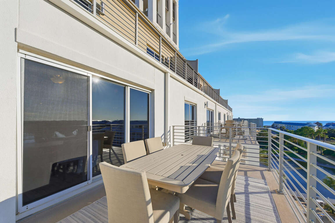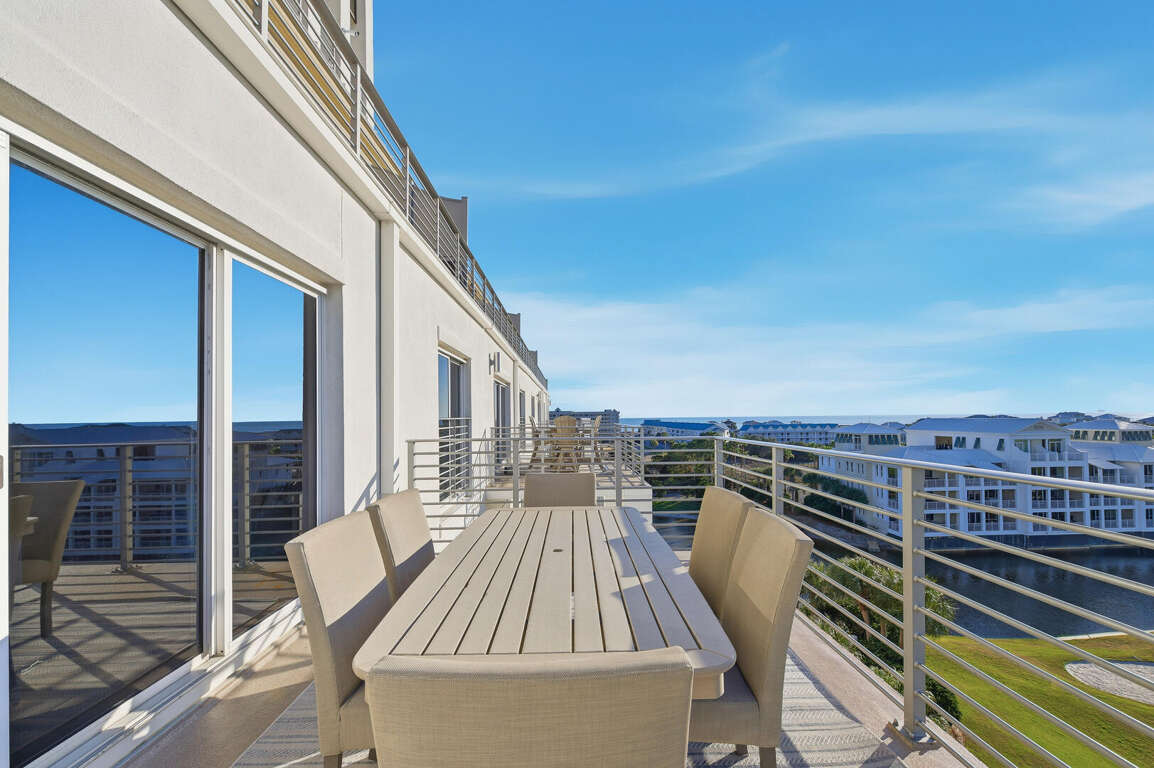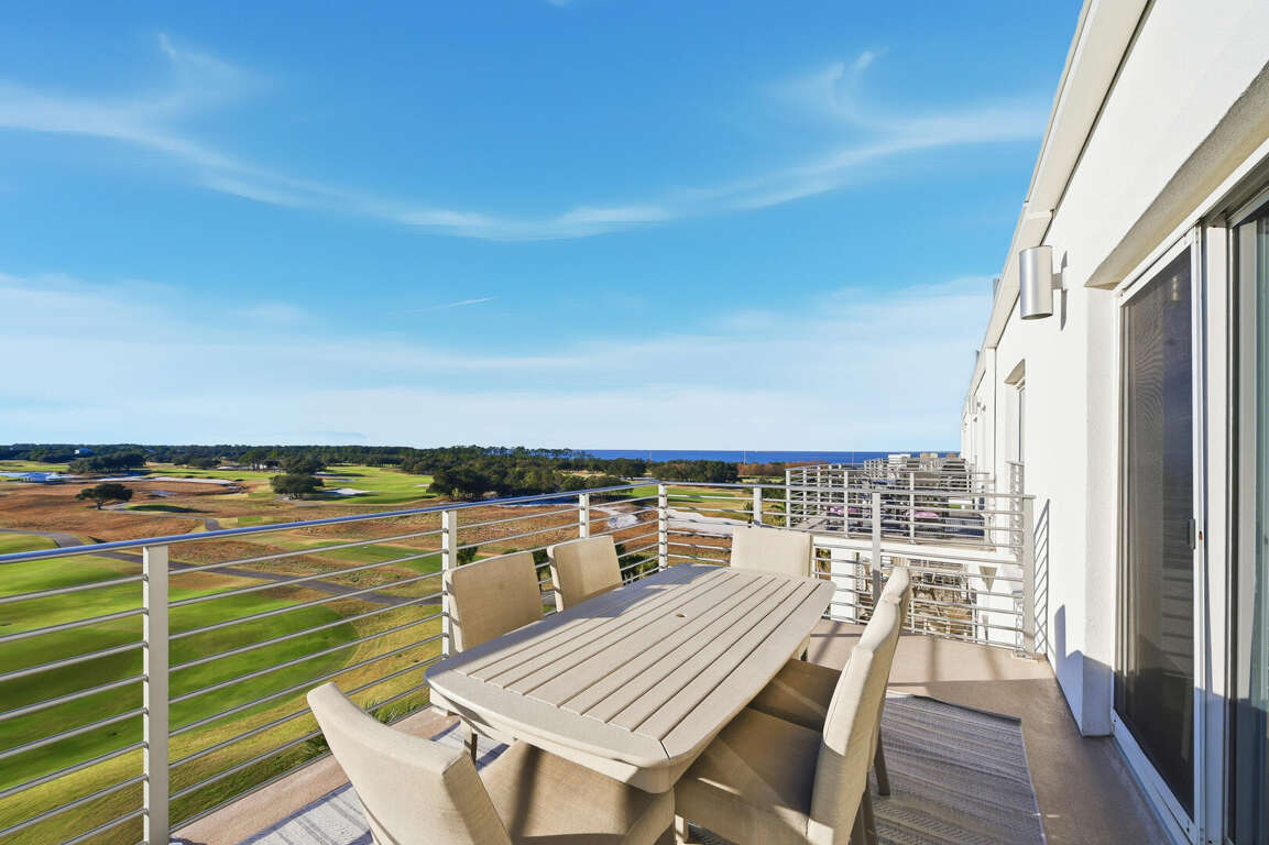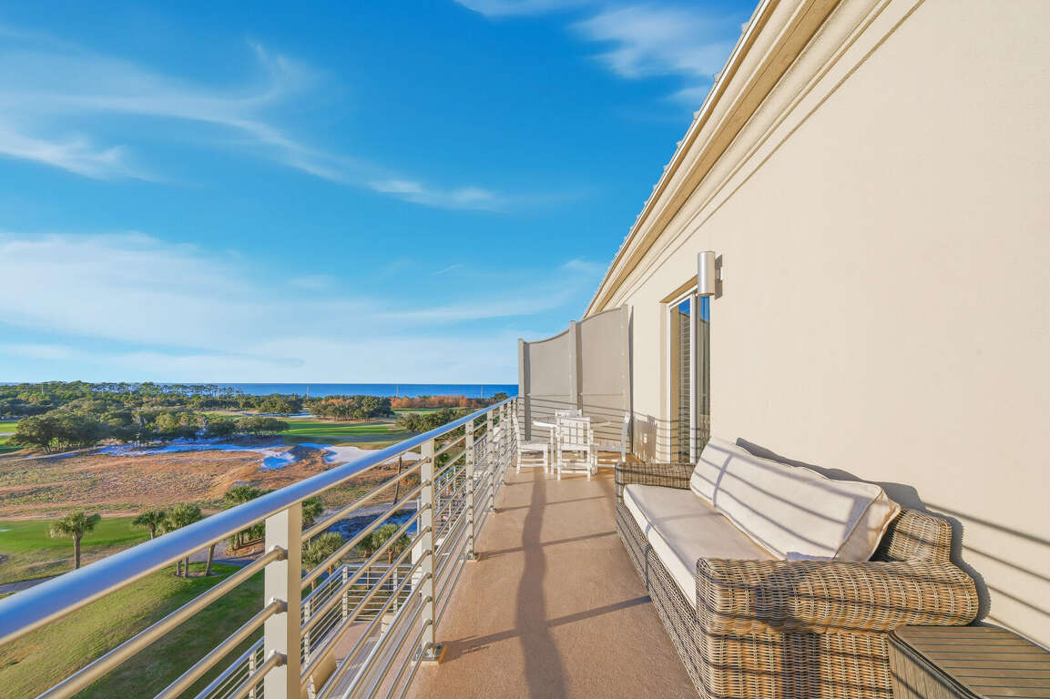 Two-story penthouse condo in Gulf Shores with 4 bedrooms, four balconies, and 2022 updates, plus resort pools and shuttle access for a vacation rental.