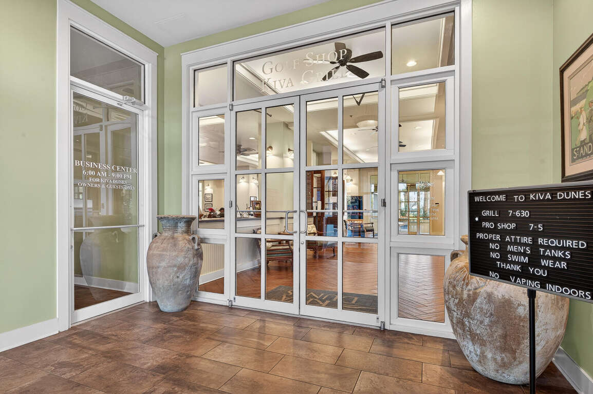 The benefits of staying in Kiva Lodge you are close to Kiva amenities that are located at the Lodge The Kiva Office for check-in or questions about the resort. Kiva Golf Shop for making tee time reservations, check in and golf cart pick up. Kiva Grill where you can order meals to go or enjoy a relaxing meal and drinks, inside or outside while overlooking the 18th hole. Hit the Fitness Room to get that workout in. The Lodge Pool to enjoy a refreshing dip to cool off. Free shuttle pick up for a quick 2-minute ride out to Kiva Beach Club that features a beach front pool with full-service bar and restaurant or a quick ride to two additional pools or beach walkovers to Kiva's beach.
