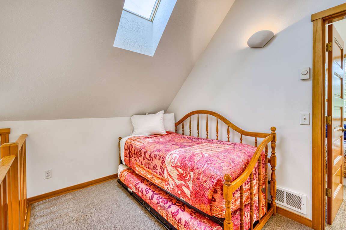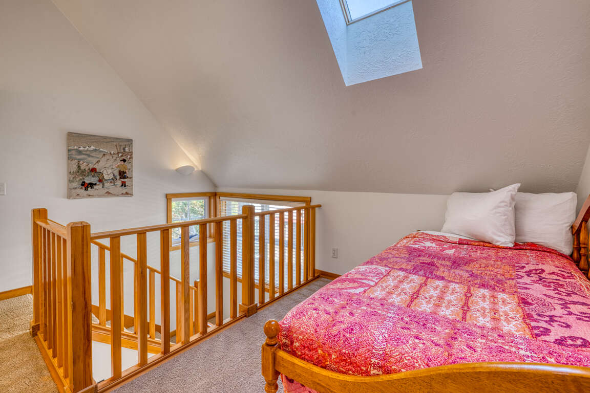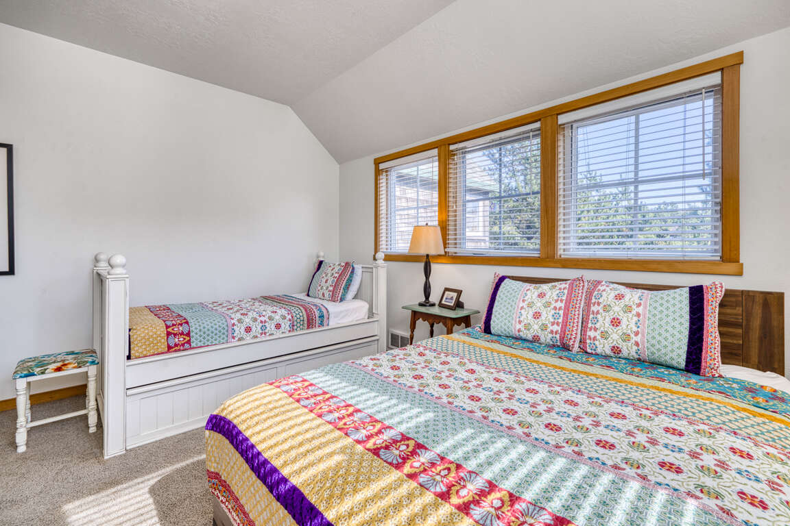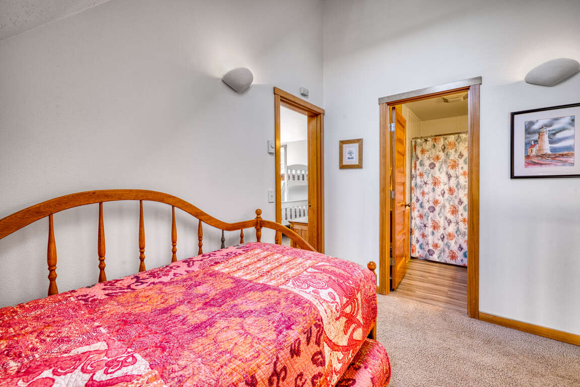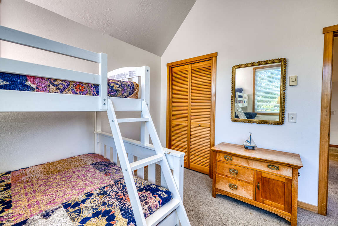Upstairs features the Master bedroom with a king-size bed and an en-suite bathroom, a guest room with a queen-size bed and twin bunk beds, a third bedroom with a queen bed and trundle twin beds, and a loft area with a twin trundle daybed and a hand-washing sink. The full bathroom, featuring a soaking tub, serves the two bedrooms and the loft.