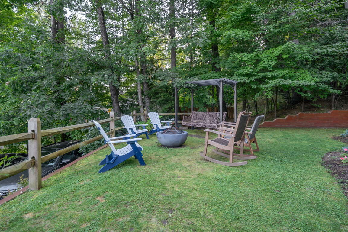 ⭑ Large stone fire pit with Adirondack chairs, ideal for toasting S'mores